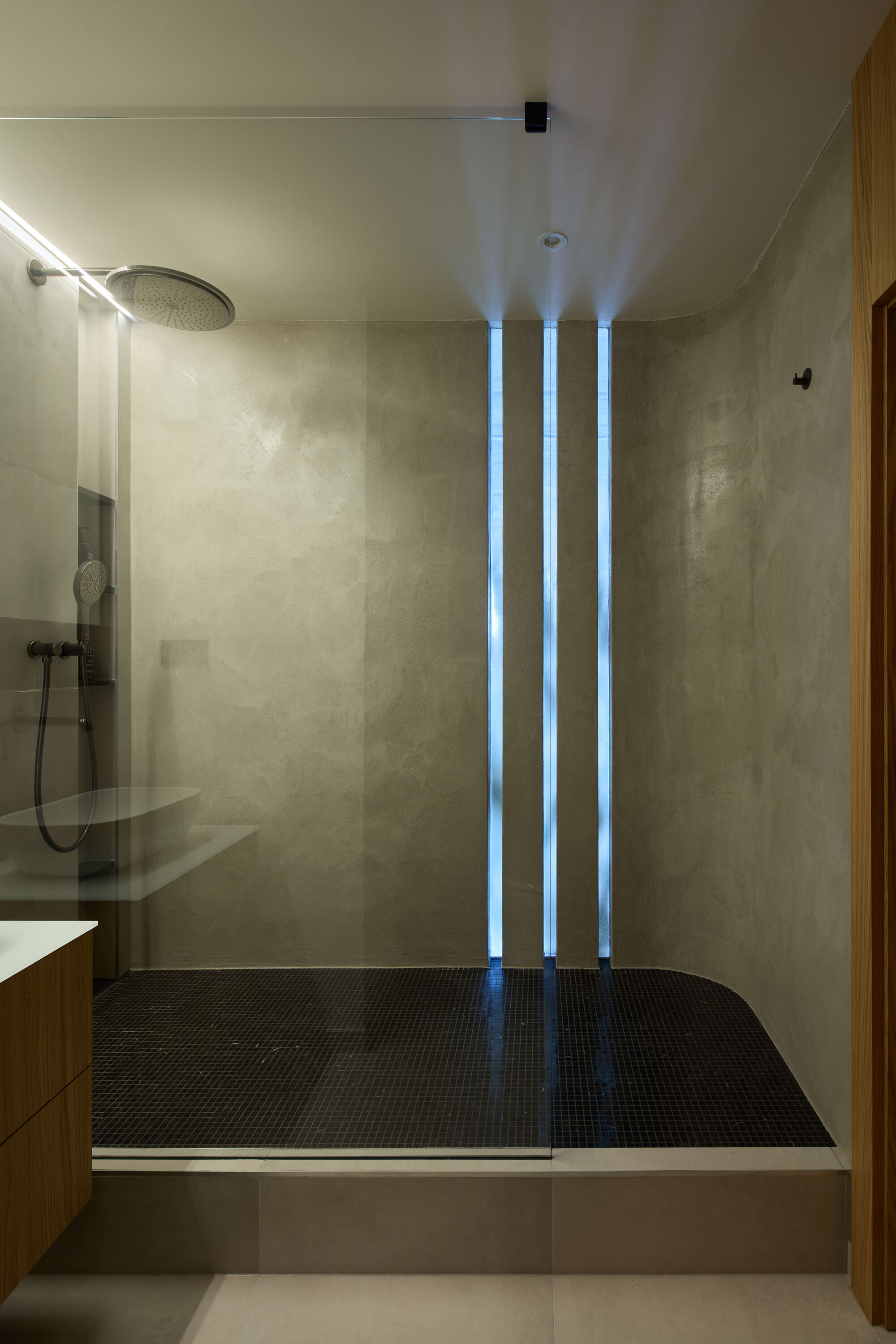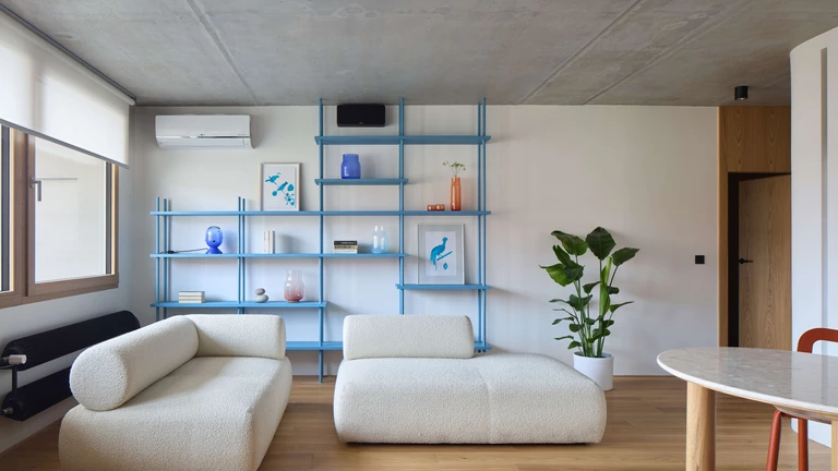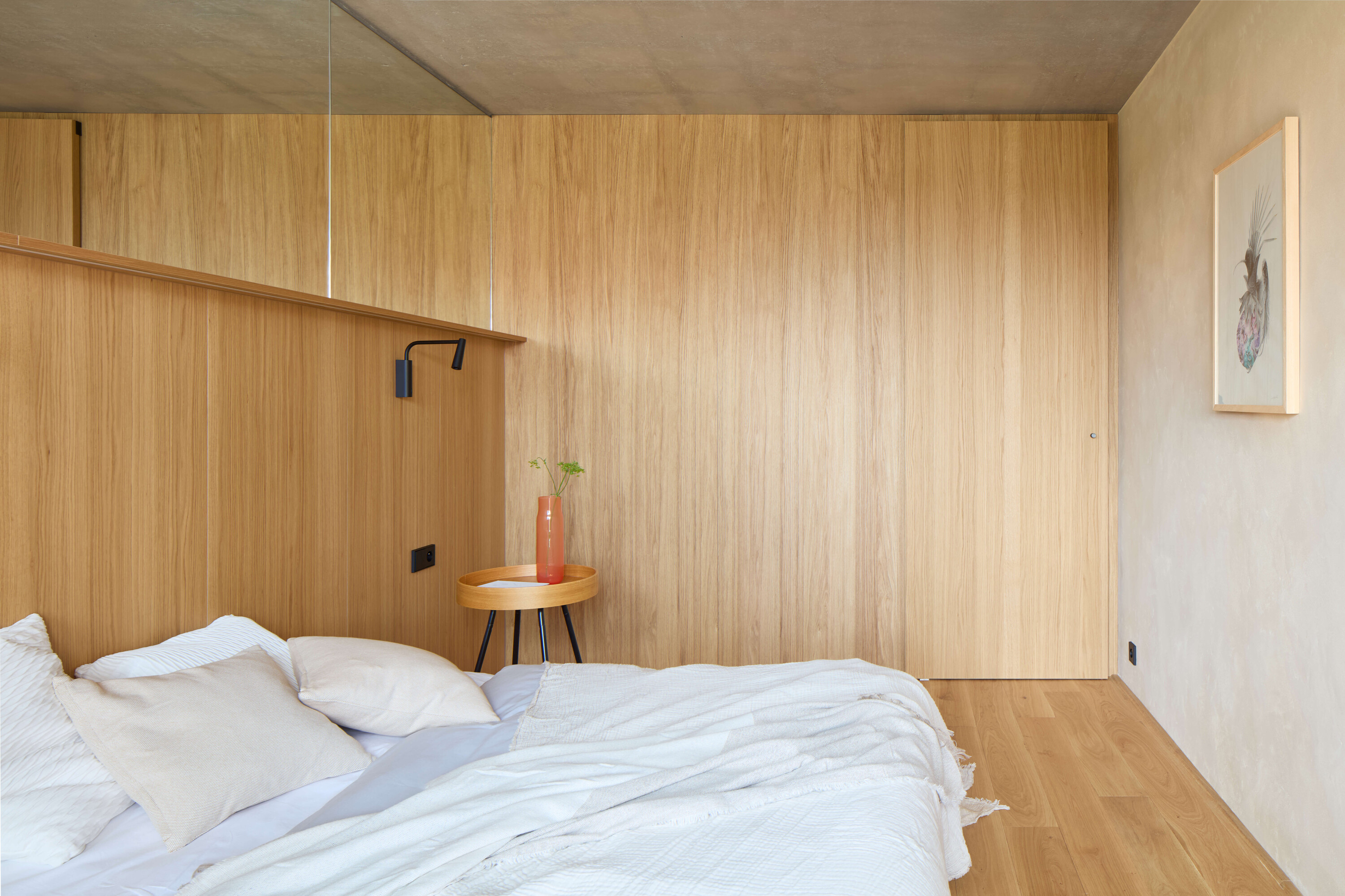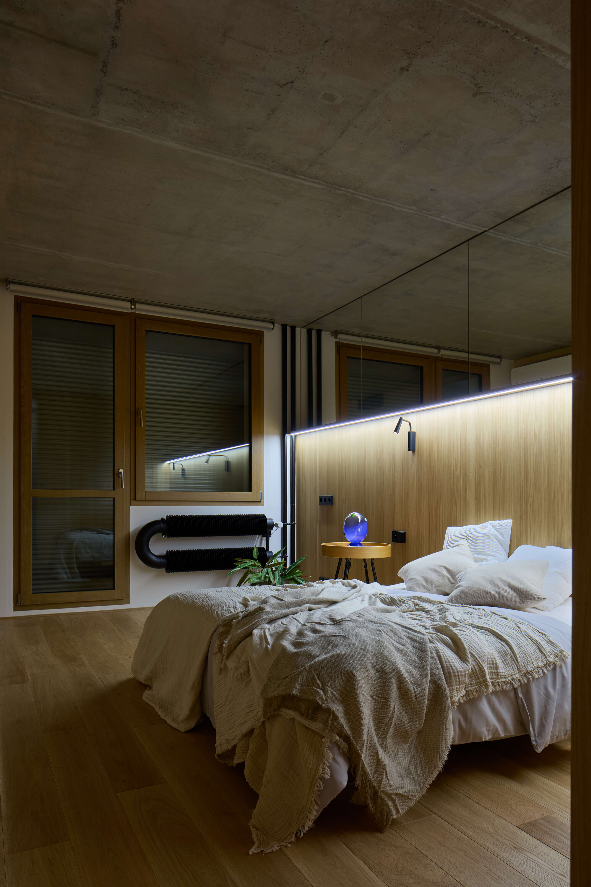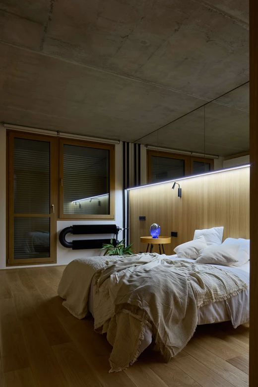 Sypialnia stanowi kontrapunkt dla energetycznej strefy dziennej. Zastosowanie glinianych tynków ma przywodzić na myśl dno morskie lub spokojną plażę, do której zmierza ta architektoniczna podróż. Minimalistyczna forma wnętrza kryje w sobie zaawansowane rozwiązania technologiczne. Mieszkanie wyposażono w system inteligentnego domu Loxone oraz najwyższej klasy drewniano-aluminiowe okna z potrójnym szkleniem, które skutecznie izolują od miejskiego zgiełku, zapewniając ciszę i prywatność.