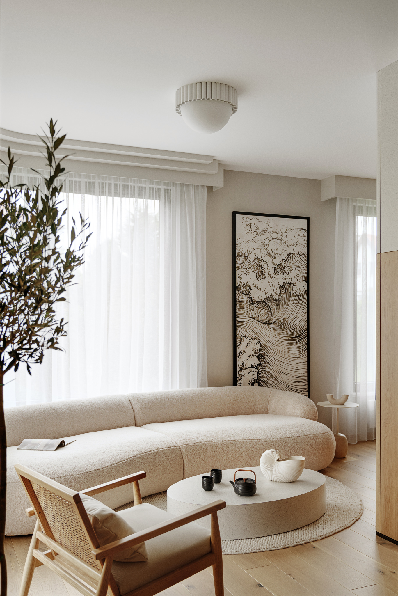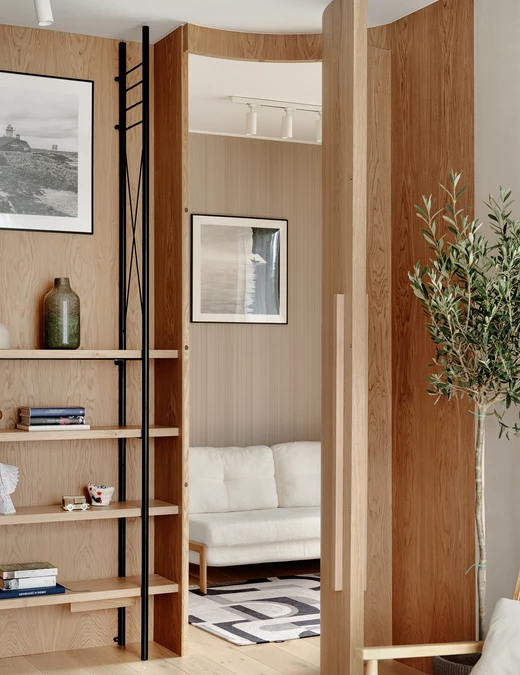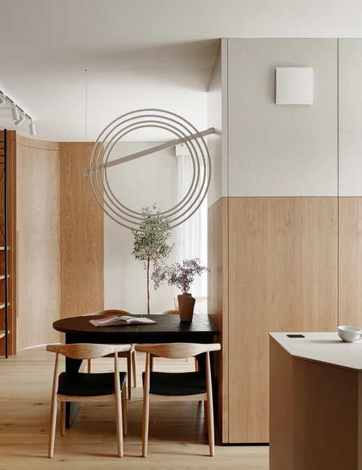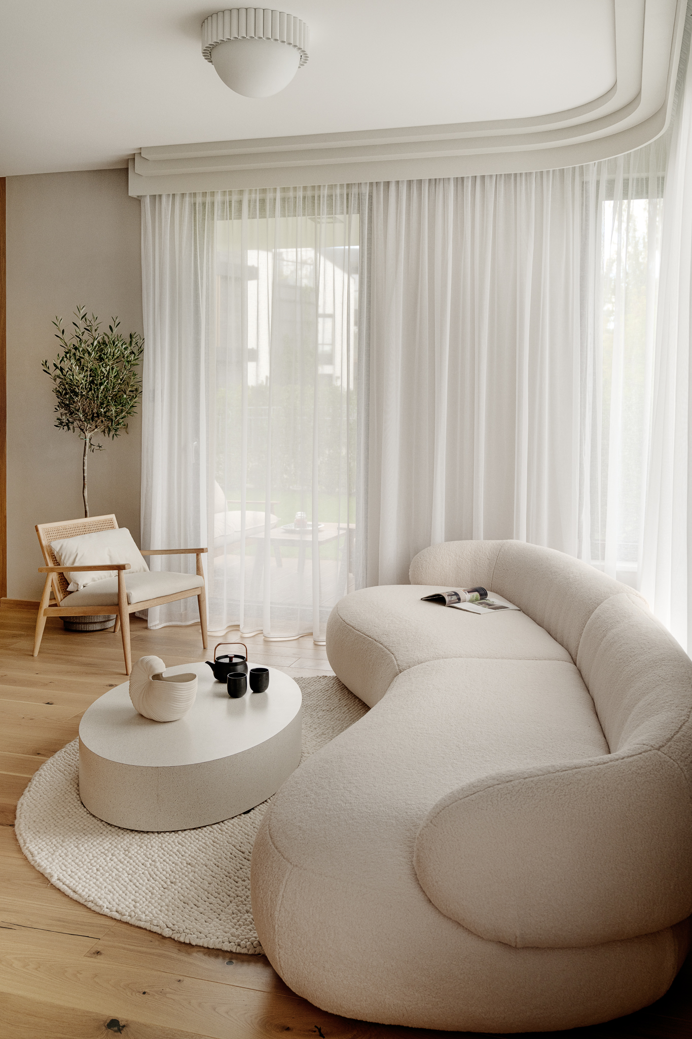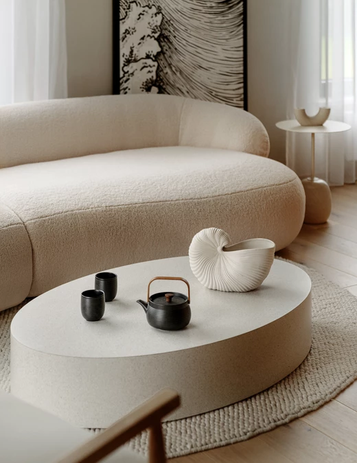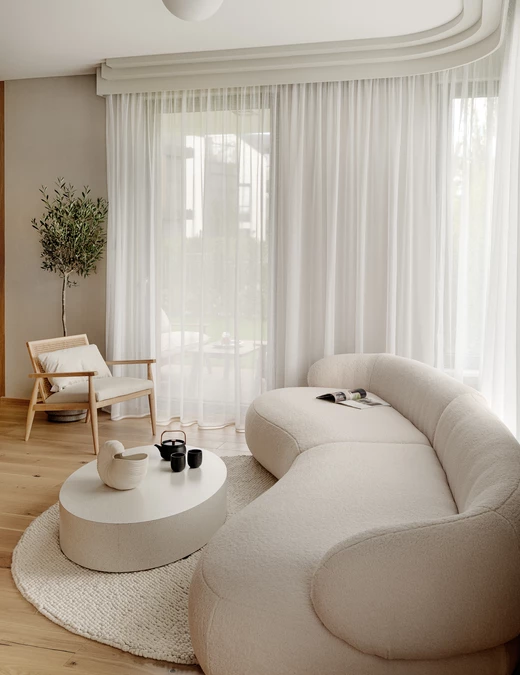 Architekt oparł projekt na idei miękkości – zarówno w kształtach, jak i świetle. Zrezygnował z ostrych kątów i geometrycznych podziałów, zastępując je łukami i zaokrągleniami. Płynne linie ścian, mebli i drzwi nadają wnętrzu organiczny rytm, a światło, naturalne i punktowe, modeluje przestrzeń.