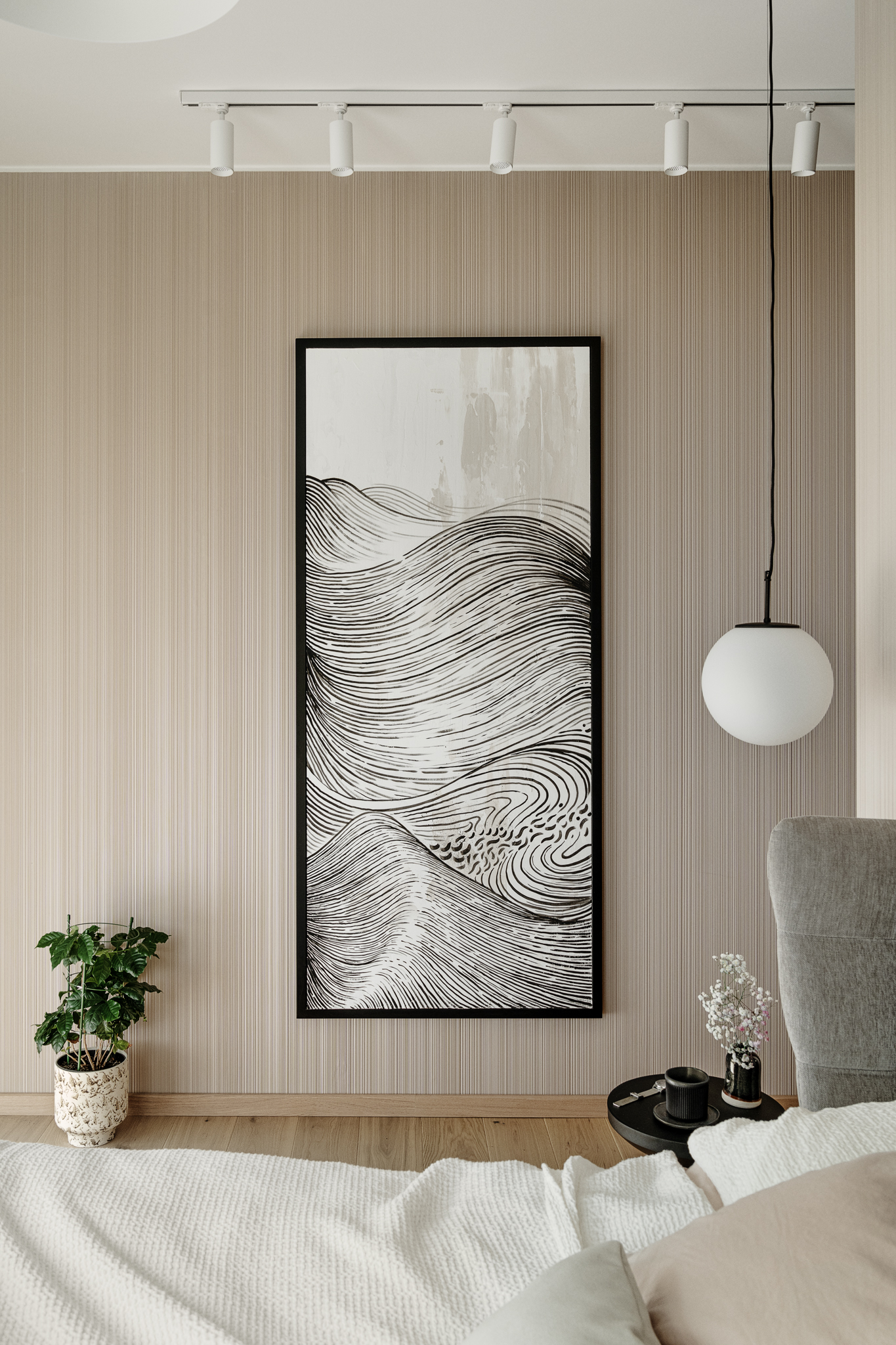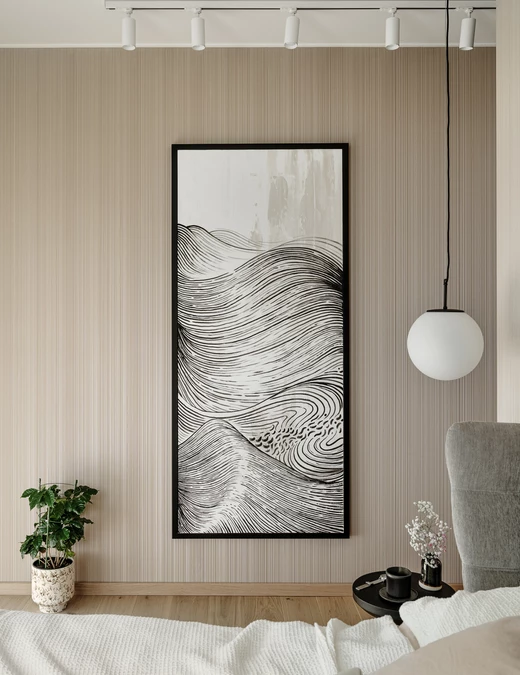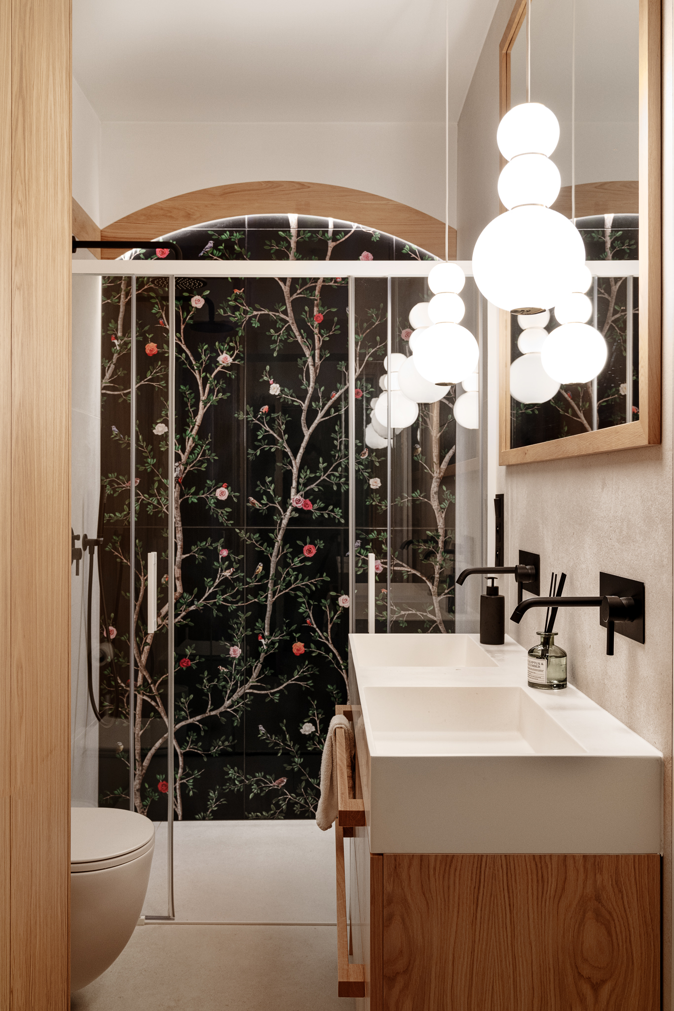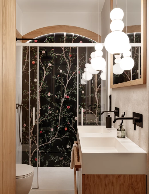 W łazience główny motyw Japandi zostaje przełamany. Na ścianie prysznicowej pojawia się wyrazisty, kwiatowy wzór jako artystyczny kontrapunkt dla reszty stonowanego apartamentu. Całość uzupełniają autorskie rozwiązania oświetleniowe. Jedna z lamp trafiła do seryjnej produkcji, druga – inspirowana japońskimi neonami – pozostała unikatowym projektem.