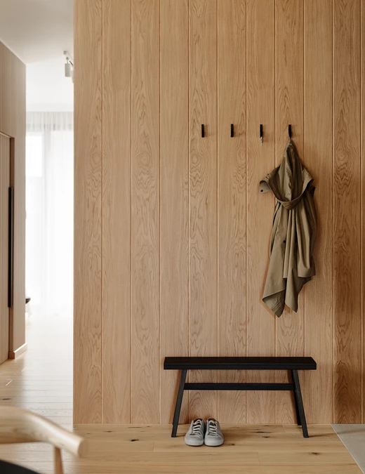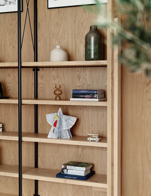 Dominującym materiałem jest dąb, wykorzystany na podłodze, w zabudowach i detalach stolarskich. Jego ciepły odcień starannie dobrany w procesie wybarwiania tworzy z tkaninami i tynkami o matowej strukturze harmonijną, spójną całość. Architekt współpracował z rzemieślnikiem z Kaszub, z którym od lat doskonalił idealny ton i fakturę drewna.