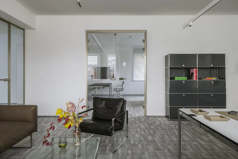 Specyfika działalności firmy, jej przywiązanie do jakości i solidności znalazły odzwierciedlenie w wystroju. Znajdziemy tu najwyższej jakości materiały i najlepsze światowe marki. Na dobry design trafiamy tuż za progiem – w otwartym lobby stanęły fotele Cassina Utrecht w kolorze nawiązującym do firmowych barw Evoltec. Nad minimalistyczną recepcyjną ladą z szafek USM Haller zawisła lampa marki Delta Light. Podobną znajdziemy również nad stołem w przeszklonej sali konferencyjnej, którą projektantka ulokowała tuż obok recepcji. Wygodne, ergonomiczne krzesła Vitry oraz meble USM tworzą komfortowe warunki do szkoleń i spotkań z kontrahentami.