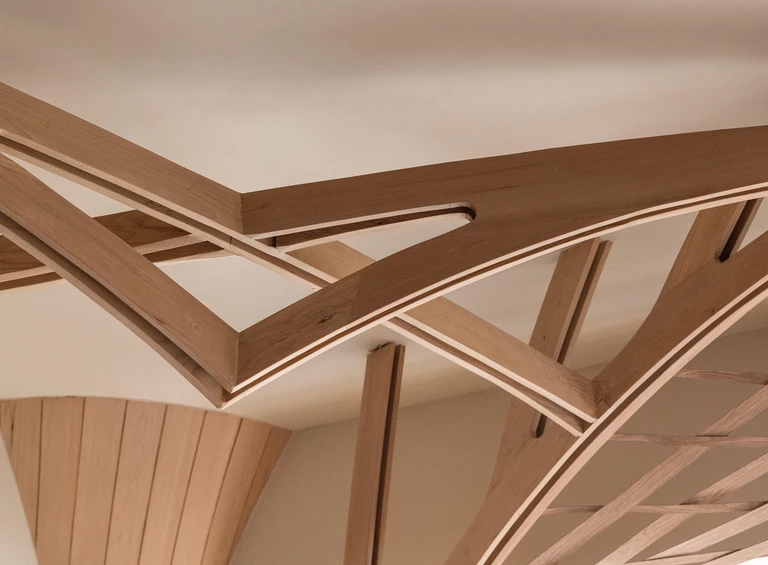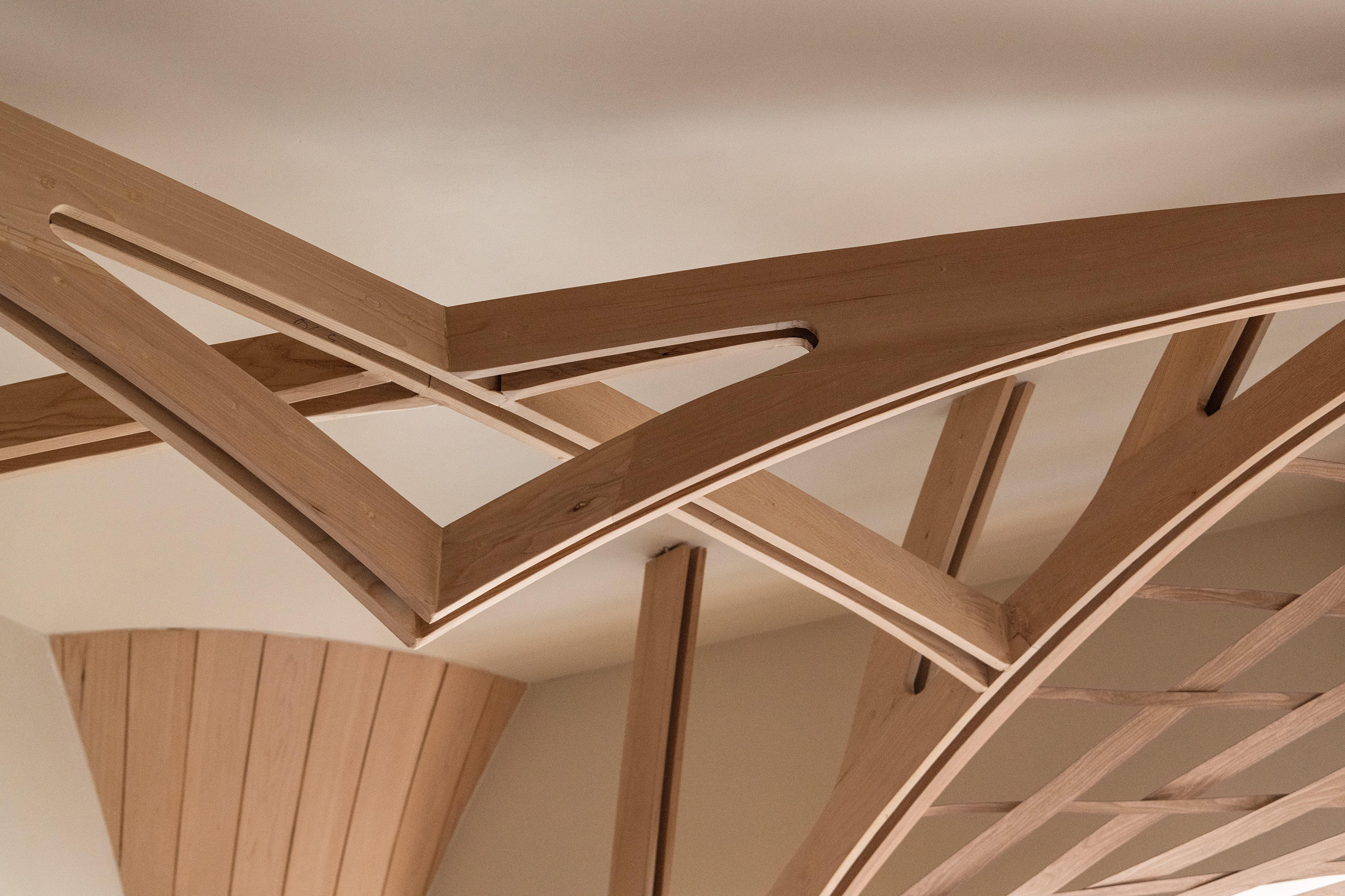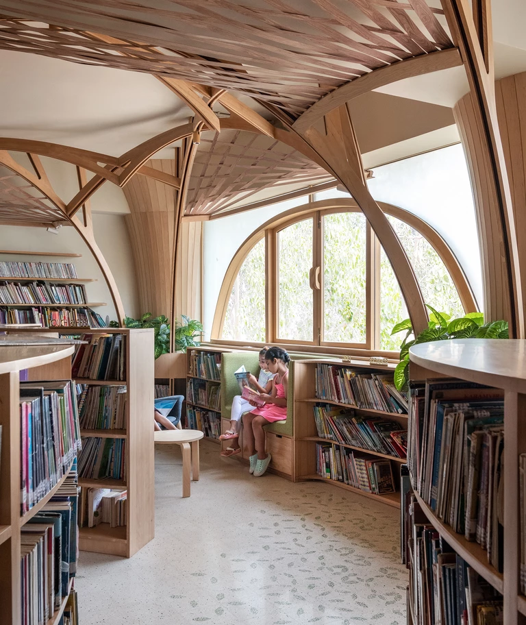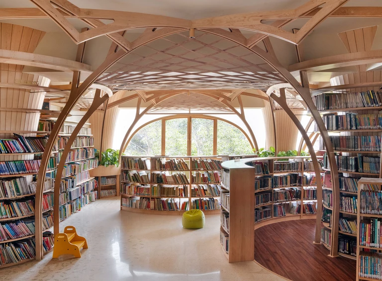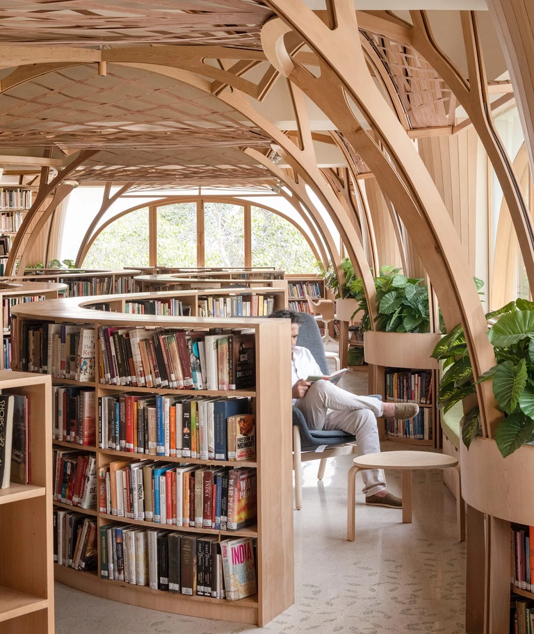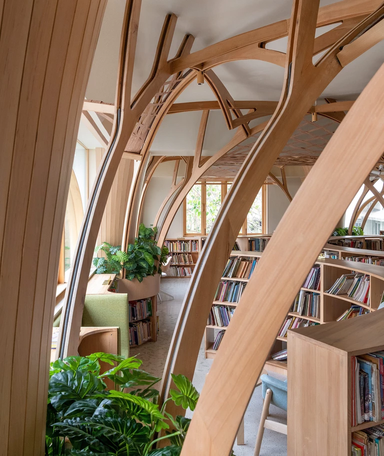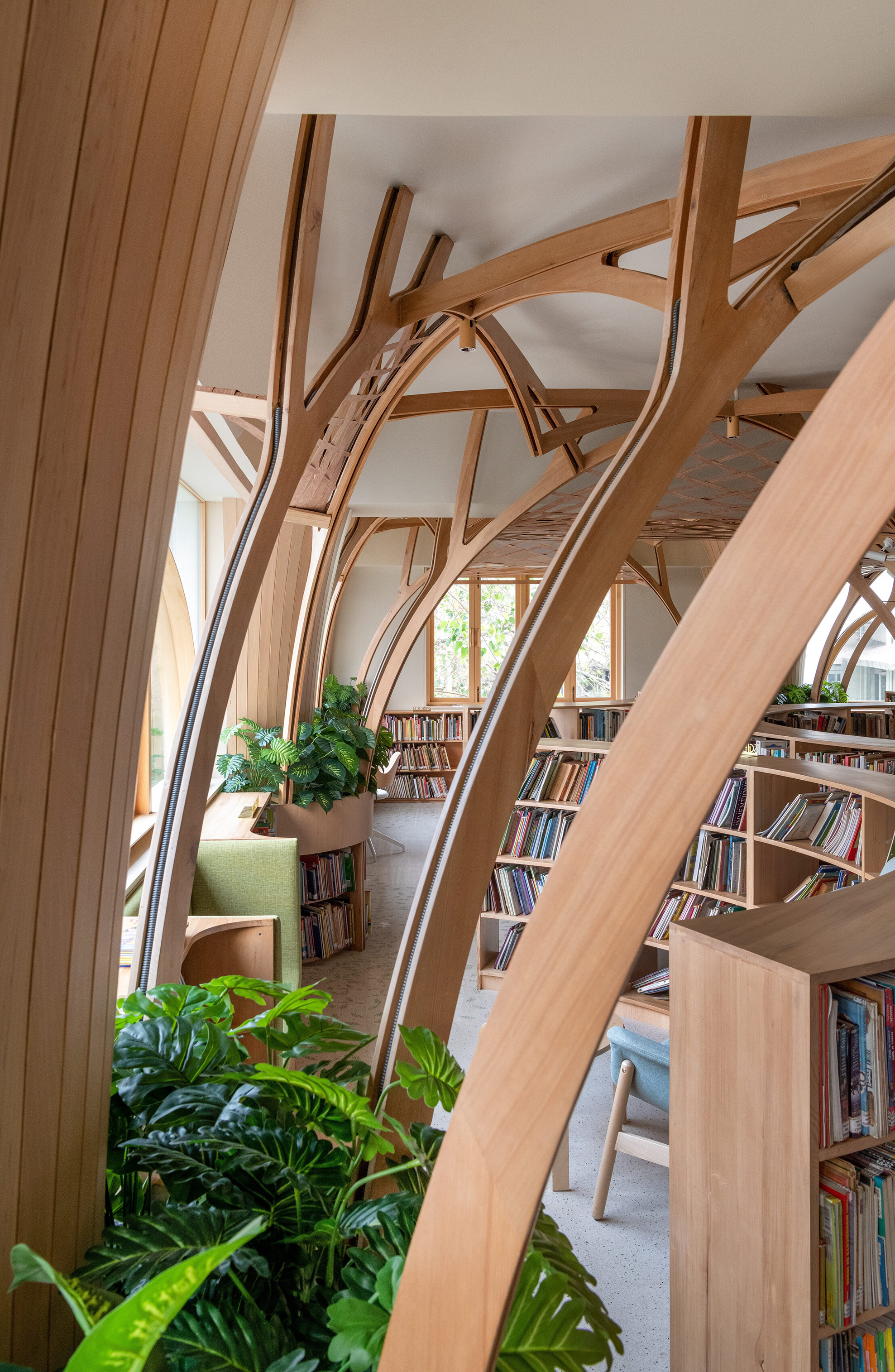 Główną inspiracją dla architektów była idea czytania książki w cieniu drzewa. Ten z pozoru prosty koncept został przełożony na wyrafinowany język architektury. Centralnym punktem biblioteki stały się istniejące betonowe kolumny, które przekształcono w stylizowane drzewa. Z ich pni wyrastają łukowate „gałęzie” podtrzymujące okrągłe półki na książki, wykonane z cykuty zachodniej. Nad głowami odwiedzających gałęzie splatają się, tworząc misterną siatkę przypominającą sklepienie leśnego gąszczu, przez które subtelnie przesącza się światło.
