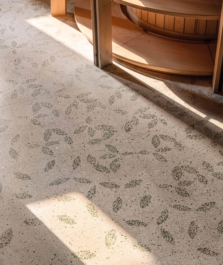 Efekt dopełnia podłoga z customowego terazzo, w którym zatopiono opiłki marmuru i zielonego szkła, tworząc abstrakcyjny wzór przypominający rozsypane na leśnej ściółce liście.