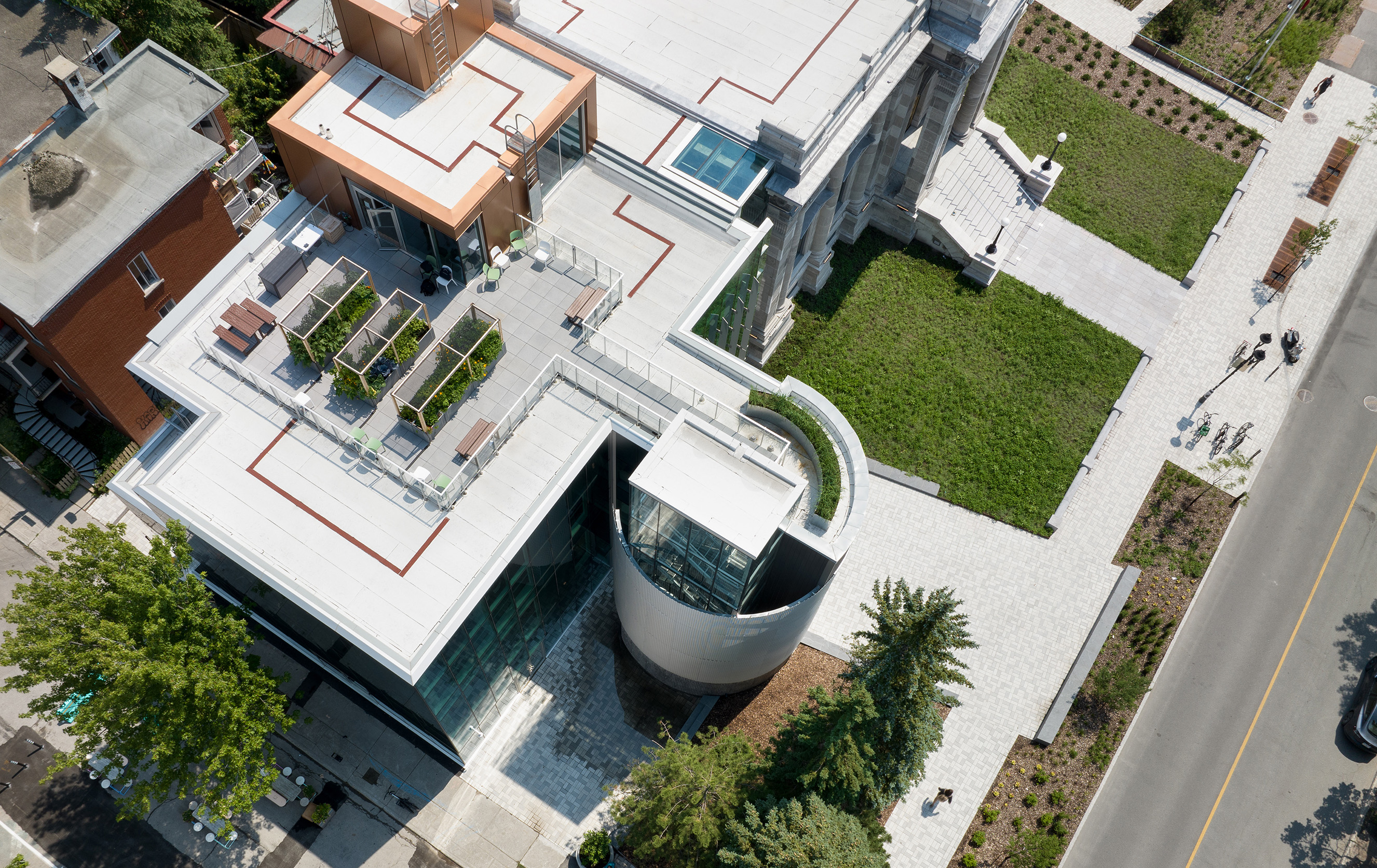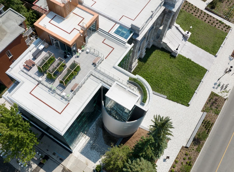 Architekci zadbali o harmonijne połączenie nowego ze starym. Linia nowej ściany osłonowej oraz rytm jej brise-soleil (łamaczy światła) zostały podyktowane przez neoklasycystyczną kolumnadę zabytkowego budynku.