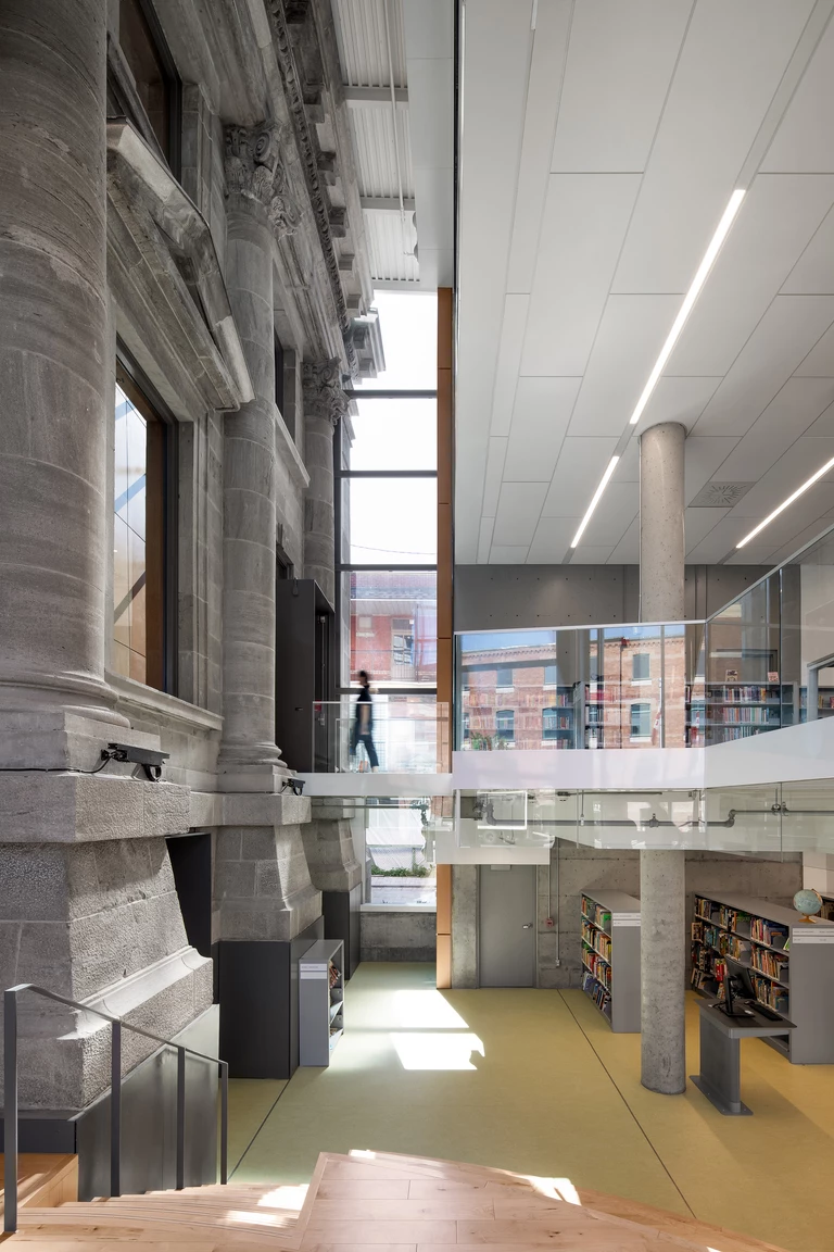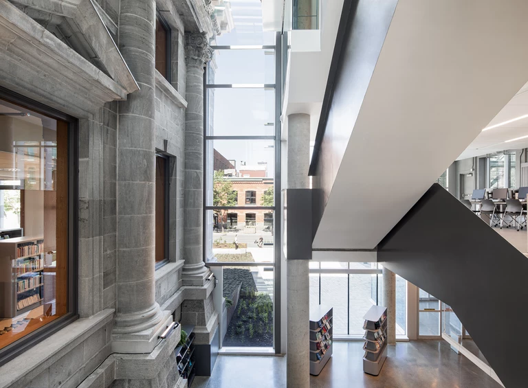 Kluczowym elementem nowej koncepcji stała się „wieża” dostawiona do wschodniego skrzydła. To wyraźny manifest współczesnej tożsamości biblioteki, mieszczący nowy rdzeń komunikacji pionowej i główne wejście. Użytkownicy o ograniczonej mobilności mogą teraz łatwo dostać się do windy, uzyskując pełen dostęp do każdego piętra, a także na mały taras na dachu. Historyczne kamienne schody zewnętrzne pełnią już głównie funkcję publicznych siedzisk.