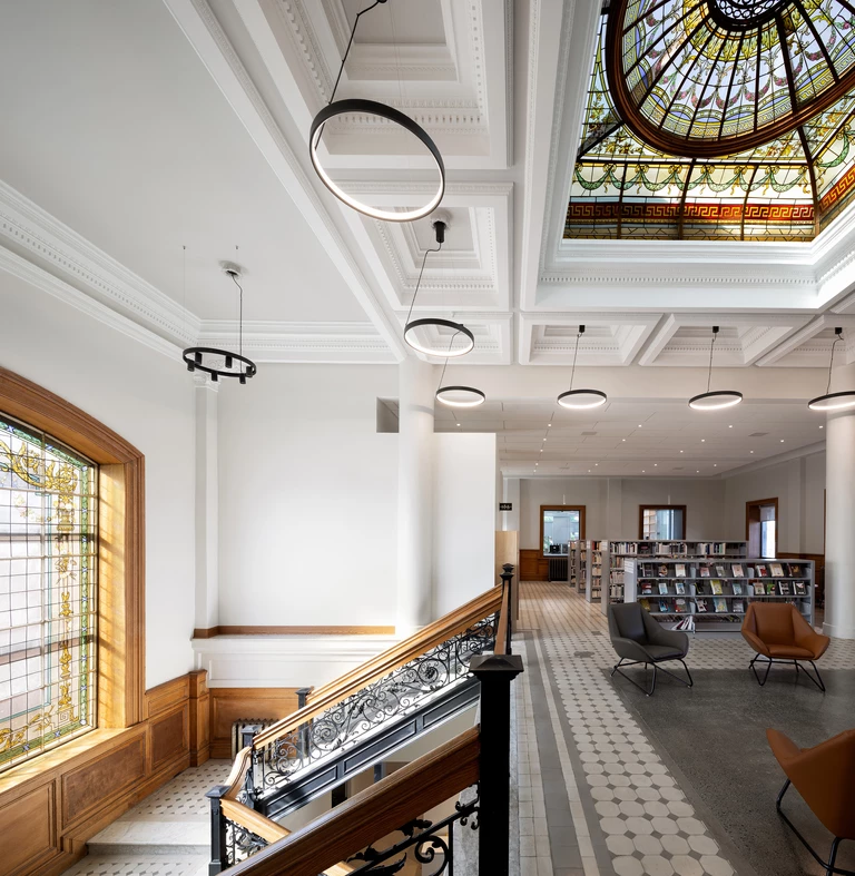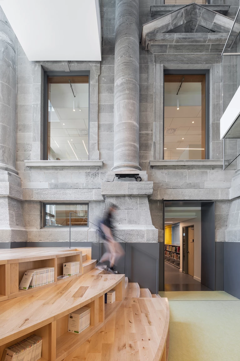 Równie istotnym zabiegiem, odzwierciedlającym troskę architektów o dziedzictwo, było pozostawienie pełnowymiarowej pustki po obu stronach dawnego ratusza. Daje to użytkownikom stałe przypomnienie o tym, co było kiedyś, oferując jednocześnie wglądy na imponujące kolumny oryginalnej budowli. Stalowe portale i przestrzenne luki podkreślają przejście z wypełnionych światłem współczesnych skrzydeł do bardziej stonowanej atmosfery oryginalnej struktury.