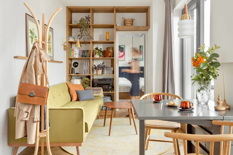 W założeniach funkcjonalnych ważne było to, aby uwzględnić rozwiązania okolicznościowe, umożliwiające np. nocowanie gości, spotkania w większym gronie i przechowywanie rzeczy, z których właściciele nie korzystają na co dzień jak np. dodatkowe krzesła. Jednym z założeń projektowych było optymalne wykorzystanie miejsca bez efektu zagracenia. Udało się to osiągnąć dzięki lekkiej, rozkładanej sofie, możliwości rozsunięcia stołu i licznych, sprytnie ukrytych schowkach.