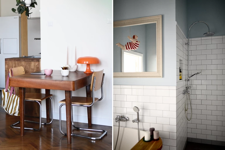 W łazience Joanna Dziurman postawiła na klasykę – to klasyczne płytki cegiełki zakończone bordiurą czy lustro w stylu „rockabilly”. Ten zestaw kolorystycznie ożywia dywan ze wzorem karo oraz rzeźba pływaczki zakupiona przez projektantkę nad polskim morzem.