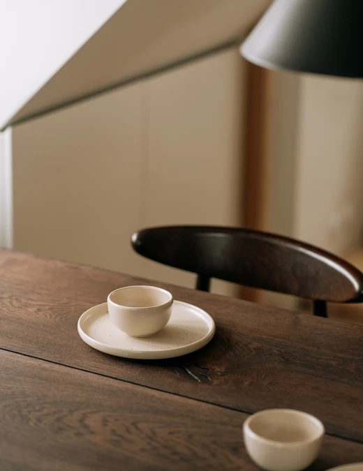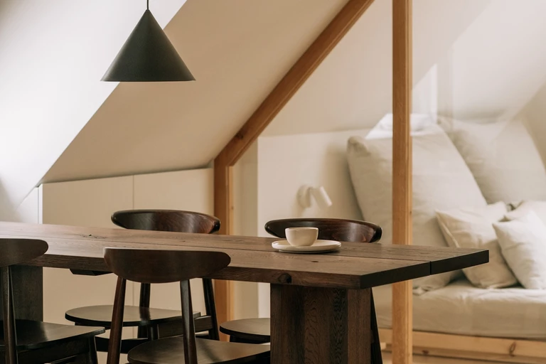 W przestrzeni wzrok przyciąga zaprojektowany przez pracownię LINE masywny stół wykonany z ciemnego litego drewna. Jego powierzchnia pokryta jest piękną kompozycją słojów, która mieni się odcieniami głębokiej czekolady i ciemnego beżu. Naturalne drewno długo posłuży domownikom i szlachetnie się zestarzeje.