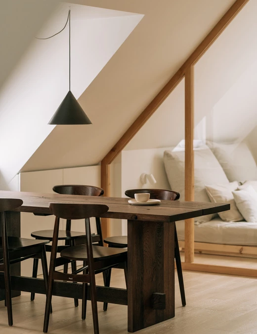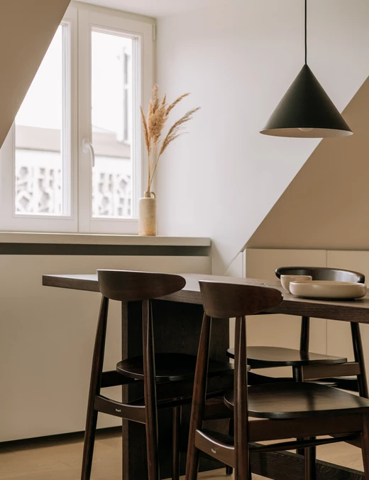 Nietypowy kształt sufitów wymagał indywidualnego podejścia i niestandardowych mebli. Wszystkie zabudowy stolarskie oraz większość mebli zostały zaprojektowane od podstaw i dostosowane do mieszkania. „Dzięki temu mieliśmy okazję autorsko spersonalizować każdy produkt oraz dopilnować najdrobniejszych szczegółów” – mówi Karolina Figel. W realizacji nic nie powstało przypadkowo. Całość stanowi przemyślany i zakomponowany układ linii, barw, faktur i światła.