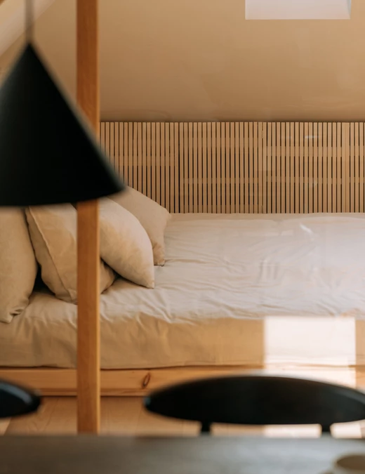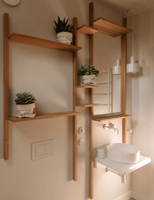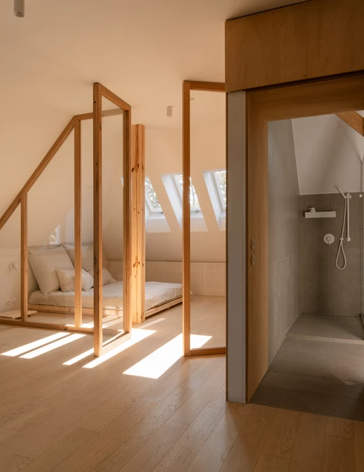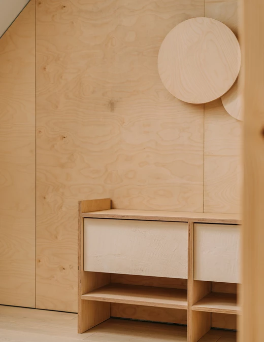 Sypialnia jest oazą spokoju – jasną i otoczoną drewnem. Niskie łóżko daje wrażenie spania na ziemi, co odrywa od codzienności. Niewiele rzeczy jest tu na widoku. „Zależało nam, aby każdy przedmiot miał swoje miejsce, dlatego w mieszkaniu możemy odkryć wiele ukrytych wnęk i szaf. Aby wydzielić dodatkową przestrzeń, dodana została zabudowa ze sklejki. Duży monolit tego materiału ukrywa szafy na ubrania oraz… łazienkę! – dodaje projektantka. Wnętrze łazienki potraktowane jest jako jedność poprzez zastosowanie tego samego rodzaju materiału na podłodze i ścianach. Drewniane półeczki wprowadzają ciepłą atmosferę.