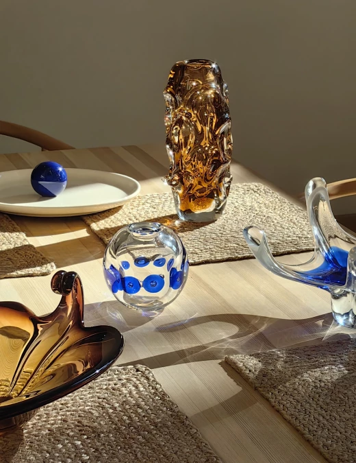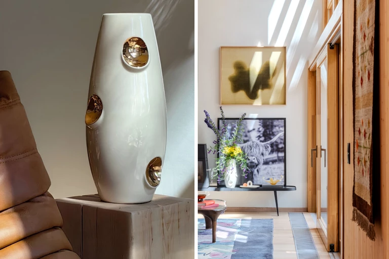Wśród wyselekcjonowanych przedmiotów znalazły się ikony designu: sofa Togo projektu Michela Ducaroy’a, ogromne lampy podłogowe Gae Aulenti, ale też unikaty polskiego rzemiosła – amorficzny stolik Tomasza Omachela, świetlne rzeźby Krzysztofa Sokolovskiego, ręcznie tkany kilim czy totemiczna ceramika Malwiny Konopackiej. Całość uzupełniają czechosłowackie patery, polskie świeczniki vintage i drewniana komoda autorstwa Michała Dobrzyńskiego-Sałka.