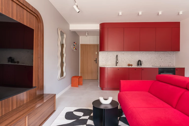 W obu mieszkaniach kolorem przewodnim stała się nasycona czerwień. W kawalerce zdobi przede wszystkim zabudowę kuchenną z zaokrąglonymi rogami oraz sofę z funkcją spania, w mieszkaniu z antresolą zaś pokrywa wysoką ścianę. W celu zachowania balansu pozostałe strefy aranżacji utrzymano w stonowanych barwach.