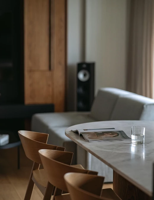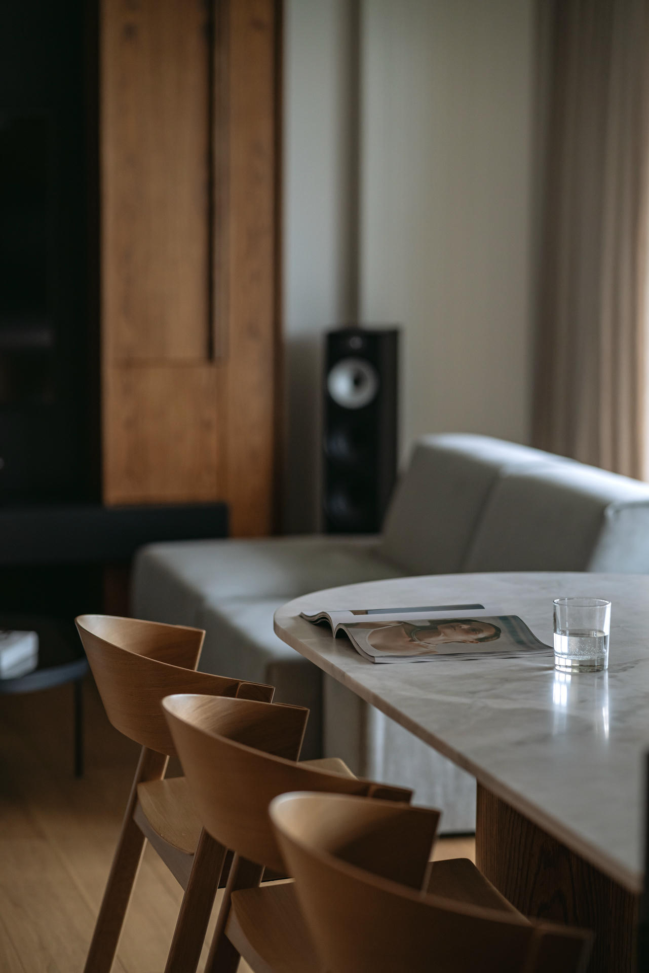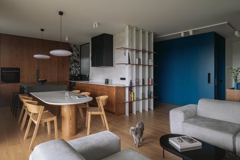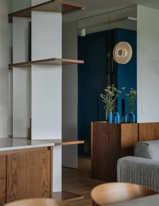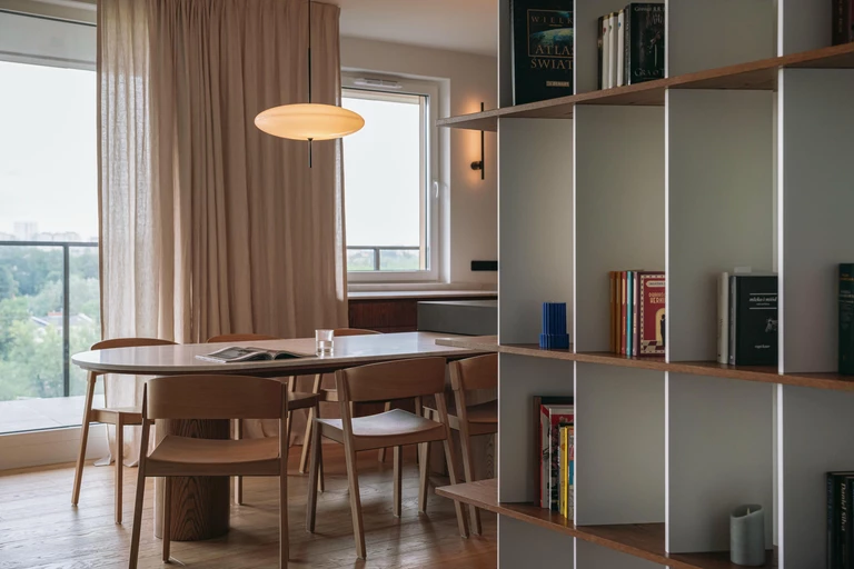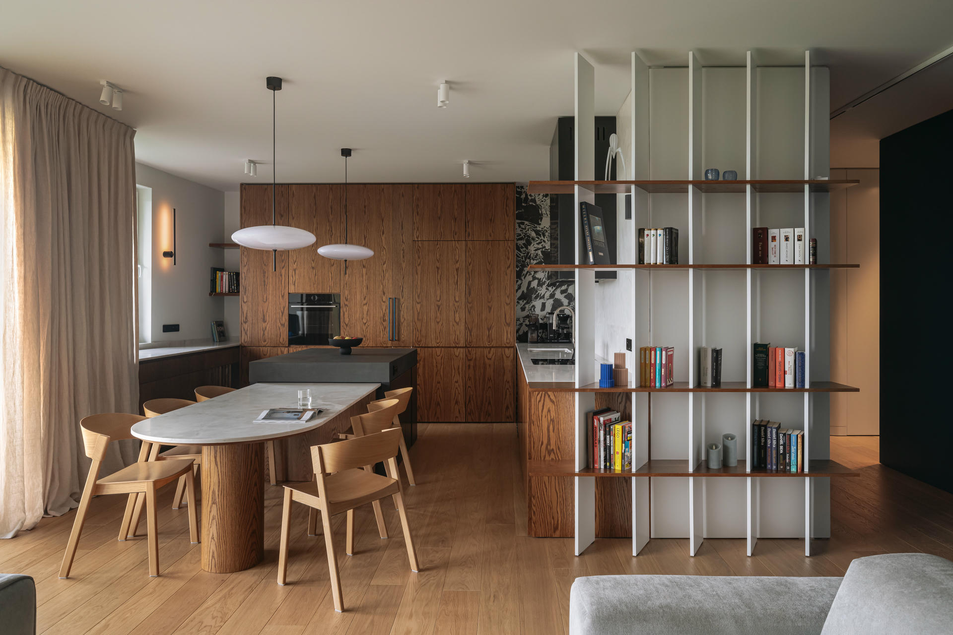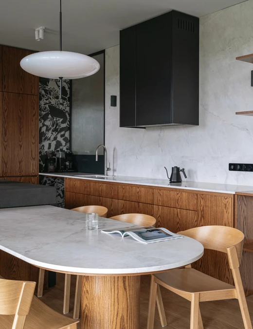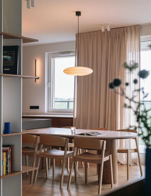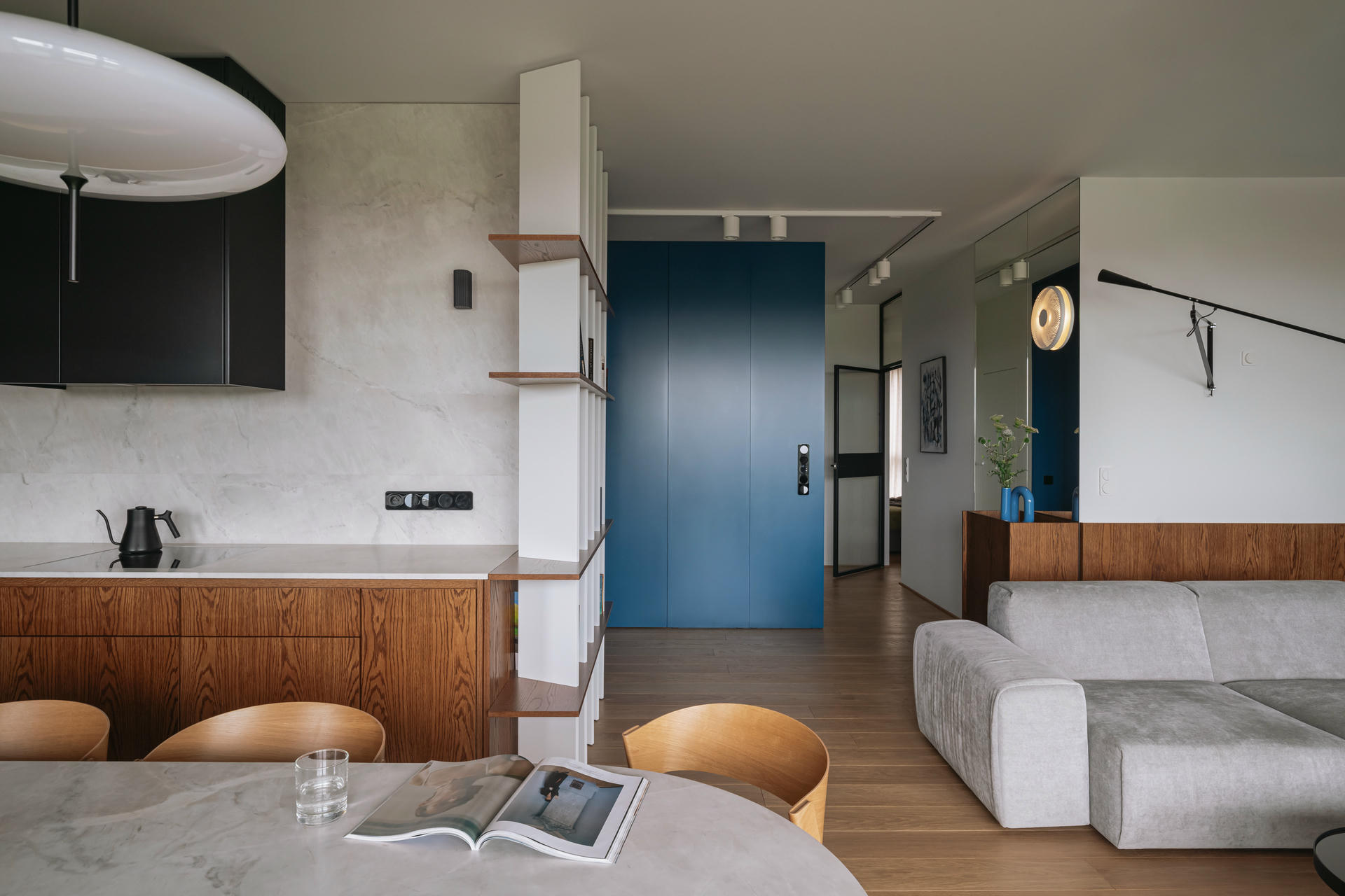 Pracownia projektowa Nuut zaprojektowała wnętrze tego 100-metrowego mieszkania dla pary z małym dzieckiem. Inwestorzy, choć świadomi swoich potrzeb, mieli odmienne preferencje estetyczne – ona skłaniała się ku jasnym przestrzeniom, on wybierał ciemniejsze tonacje. Projektantki połączyły te dwa podejścia, tworząc funkcjonalne wnętrze, które stało się tłem ich codziennego życia.