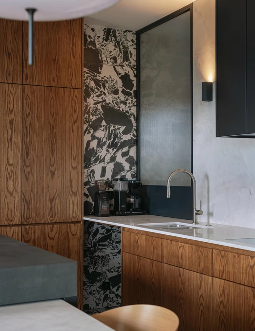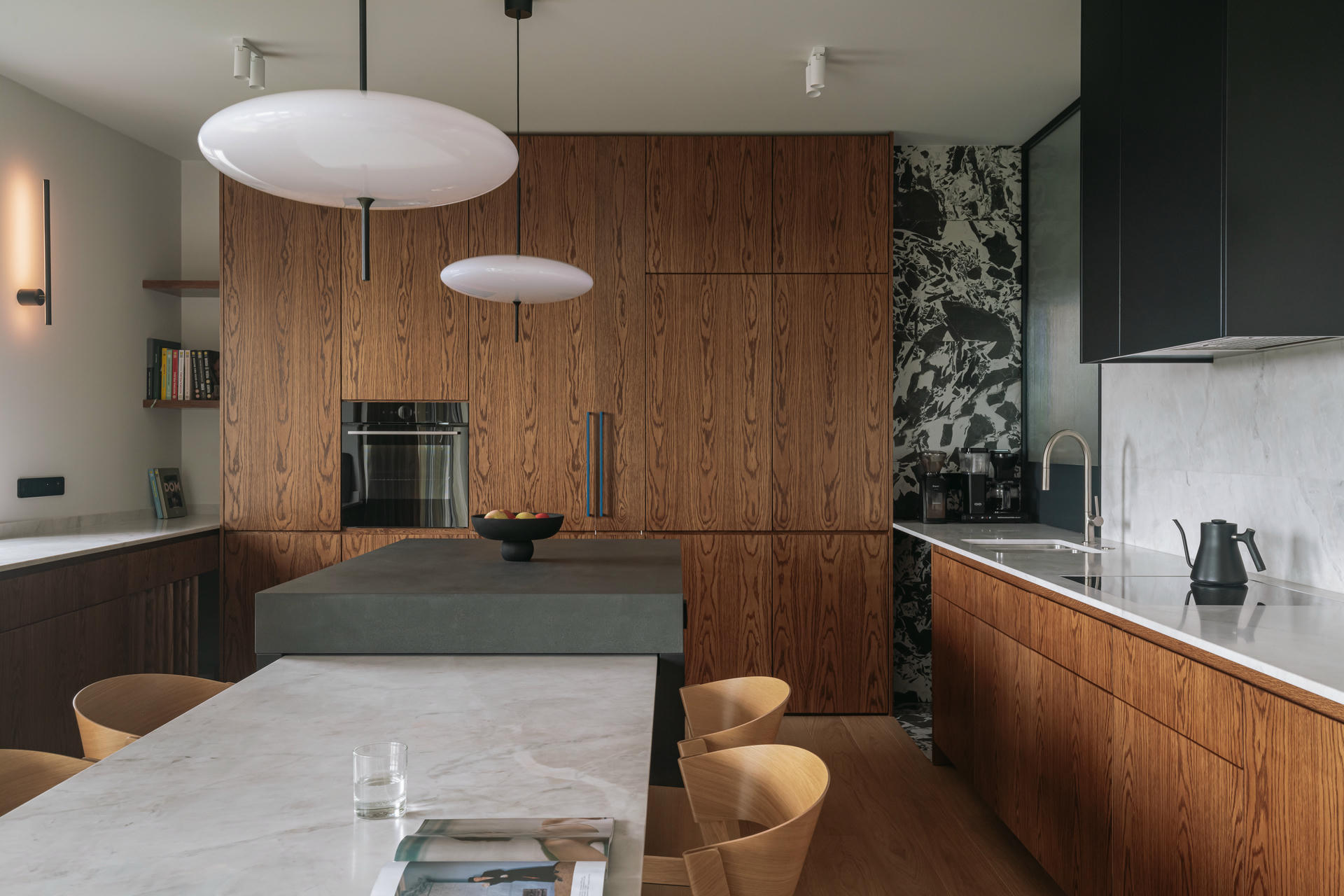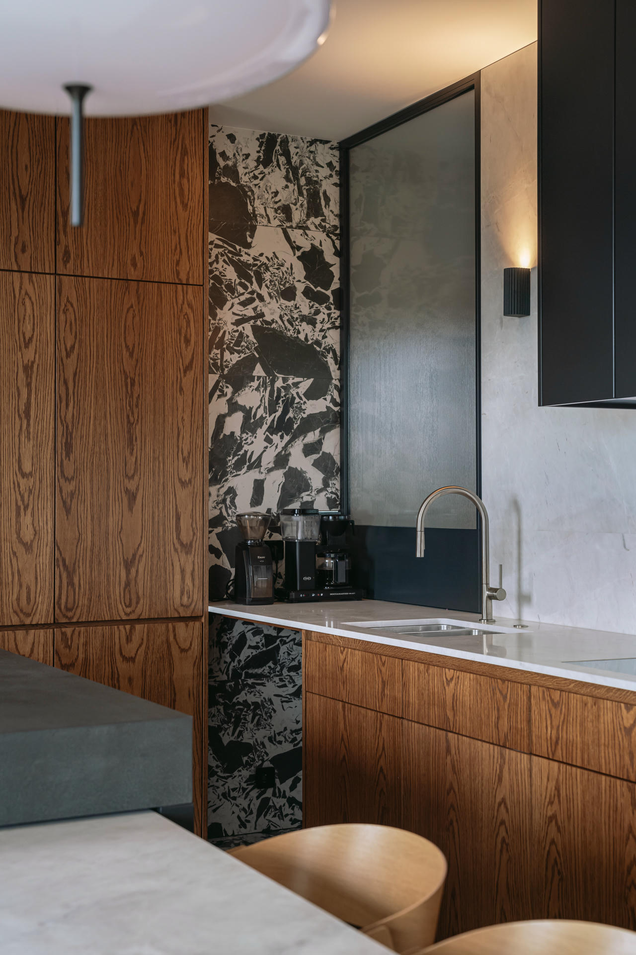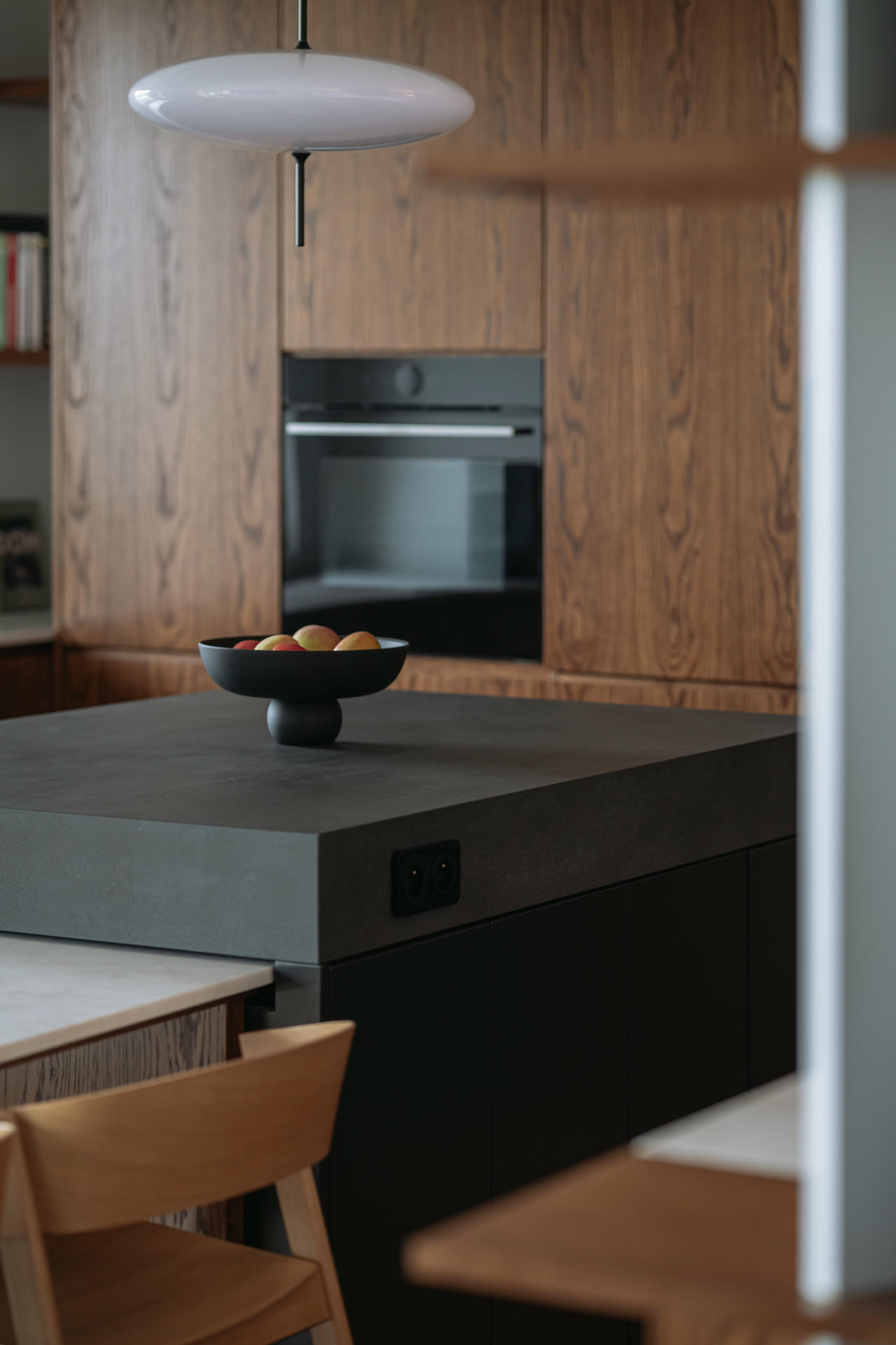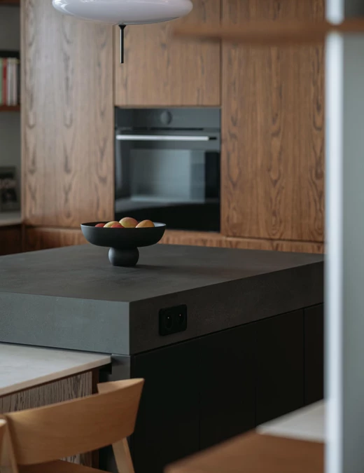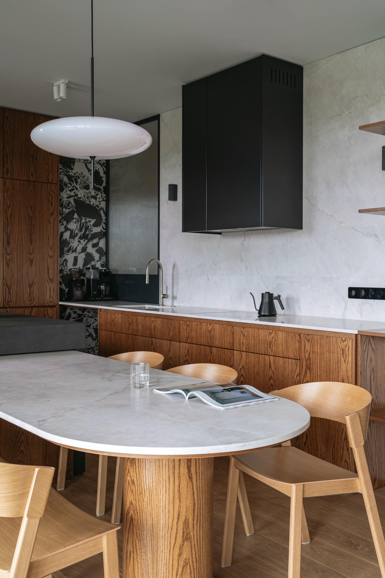 Najbardziej wymagającym etapem realizacji okazała się kuchnia. Jej ostateczny kształt to efekt współpracy kilku zespołów: stolarzy, wykonawców kamiennego blatu oraz specjalistów od niestandardowego przeszklenia.