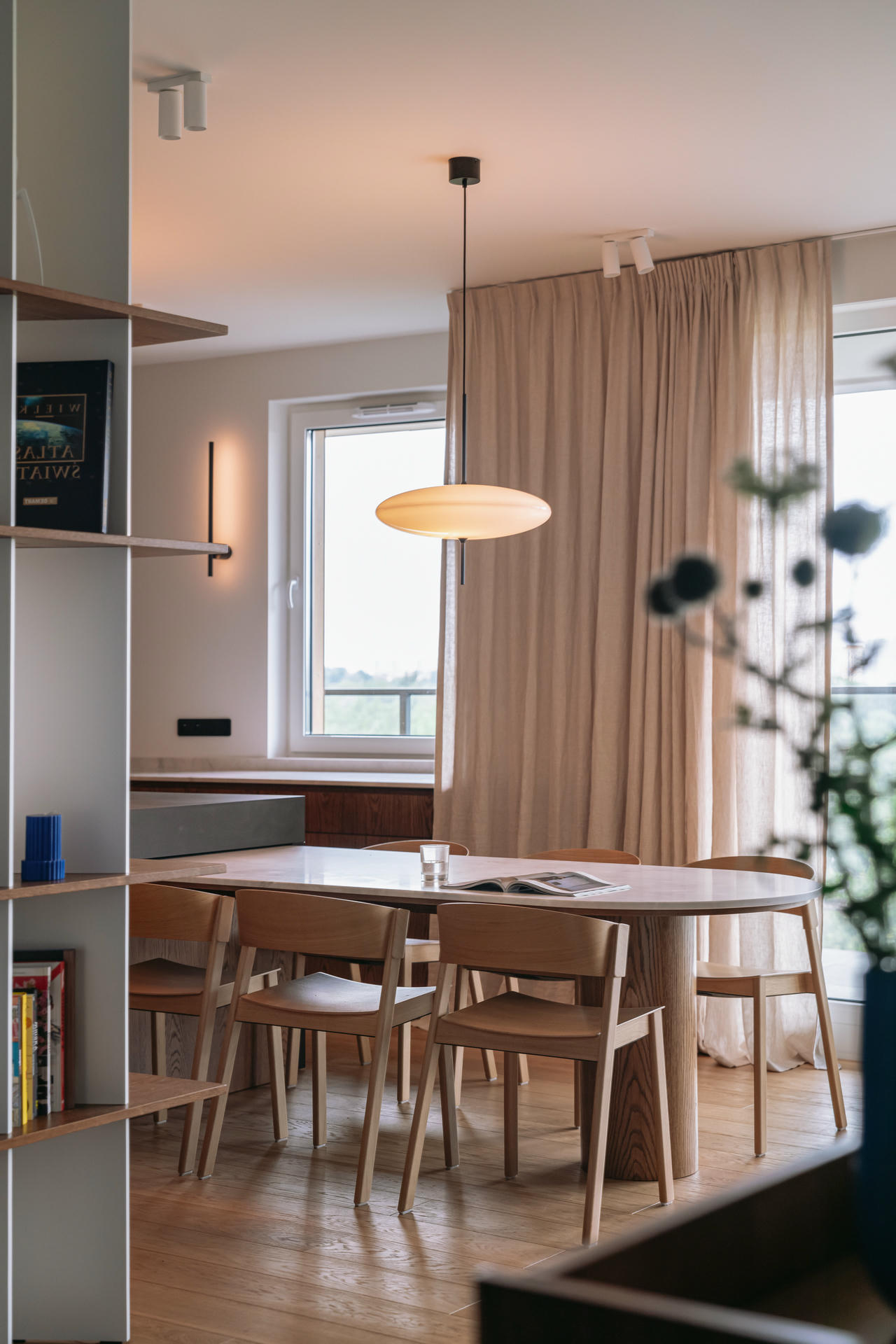 Aranżacja wymagała zmiany układu zaproponowanego przez dewelopera, a punktem wyjścia do koncepcji i sercem mieszkania stała się strefa dzienna. To tutaj toczy się większość dnia, dlatego przestrzeń miała być jednocześnie reprezentacyjna i swobodna.