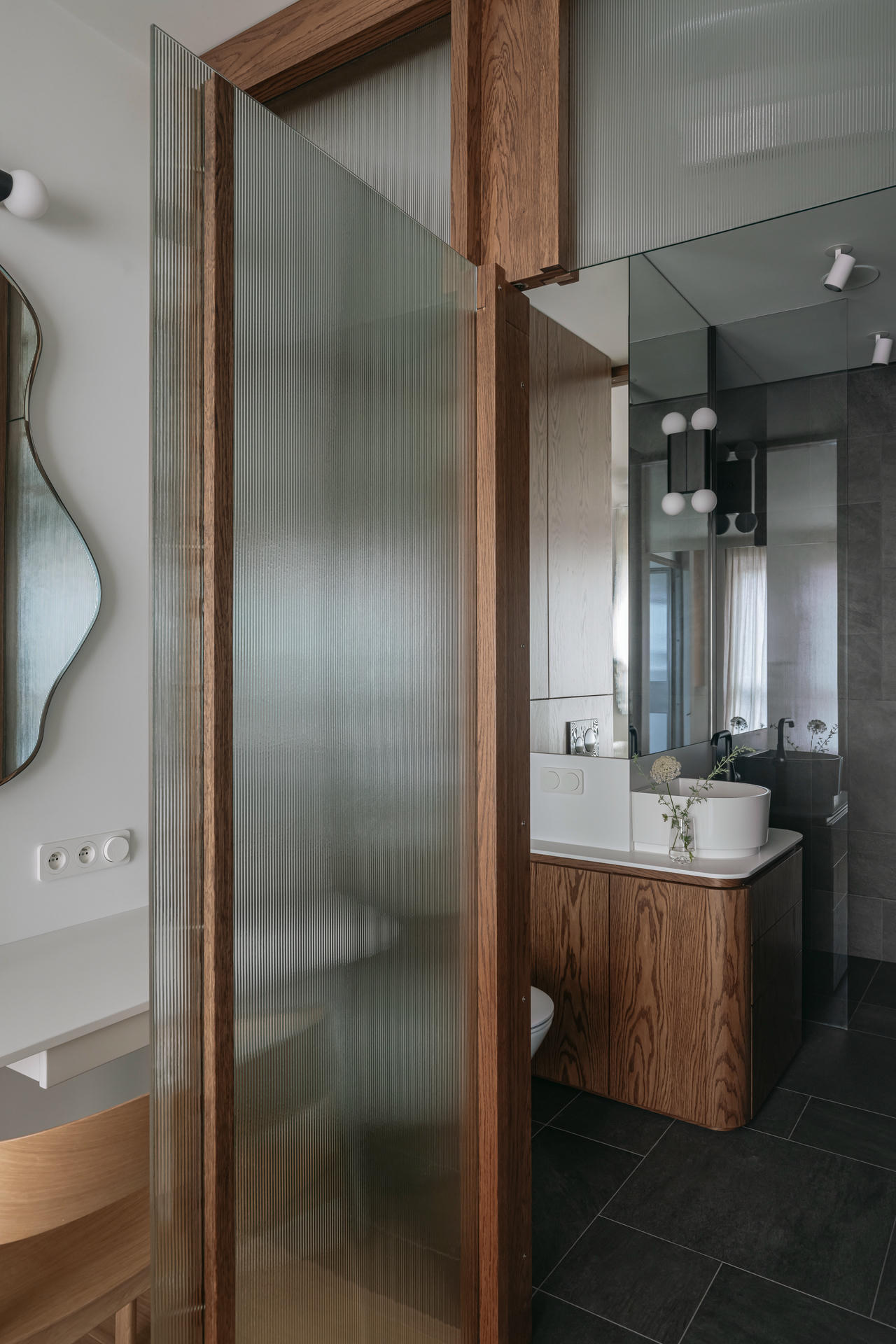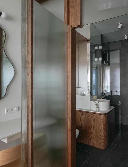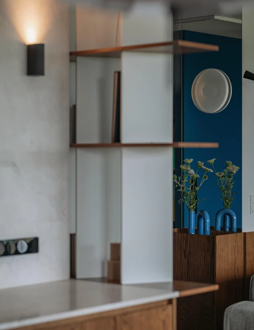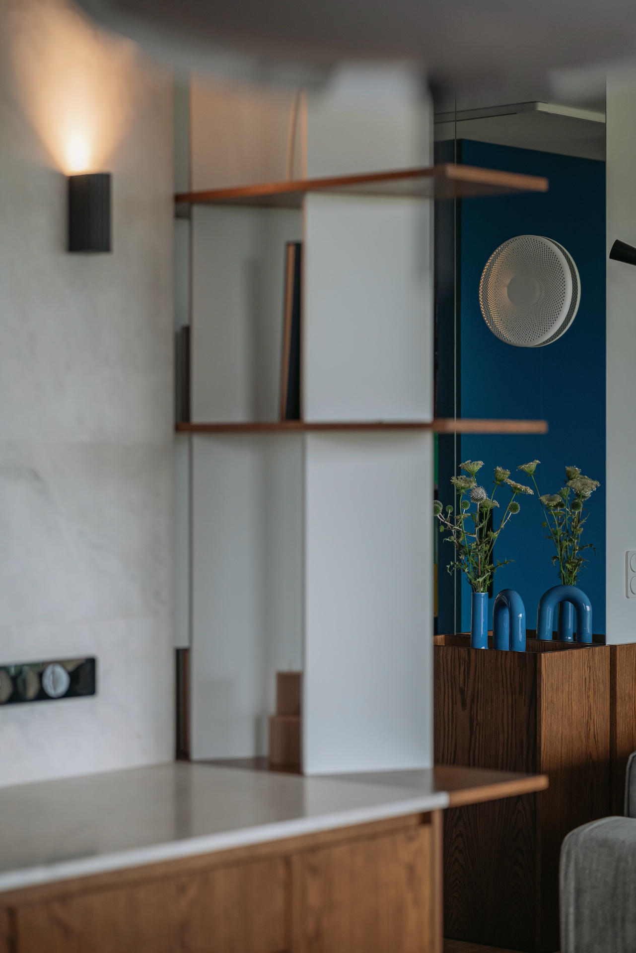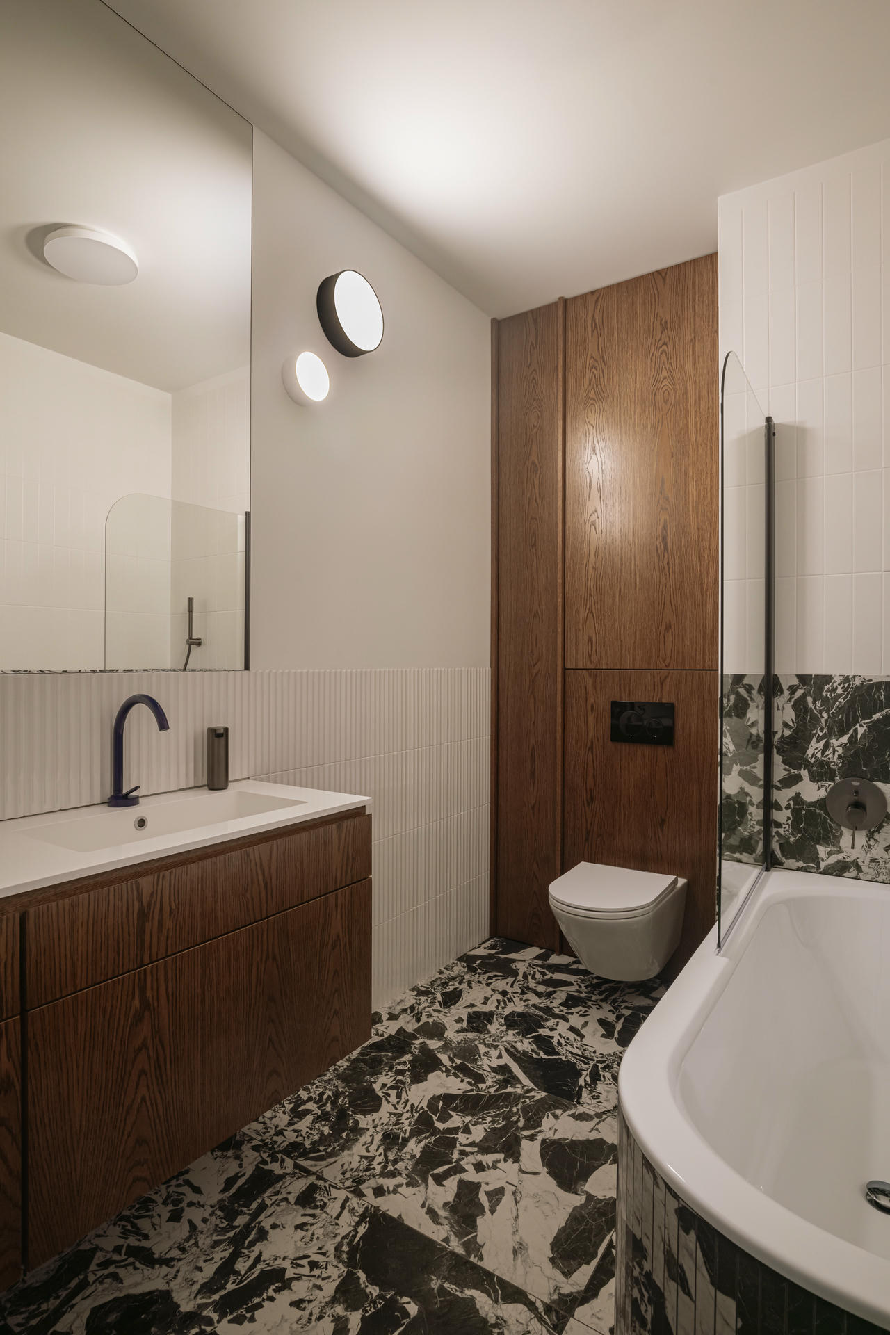 W łazience ogólnodostępnej pojawia się bardziej wyrazista stylistyka, natomiast prywatna łazienka przy sypialni utrzymana jest w spokojniejszej, ciemniejszej palecie. Całość spina subtelnie powracający odcień niebieskiego, który pojawia się w różnych częściach mieszkania jako wizualna klamra.
