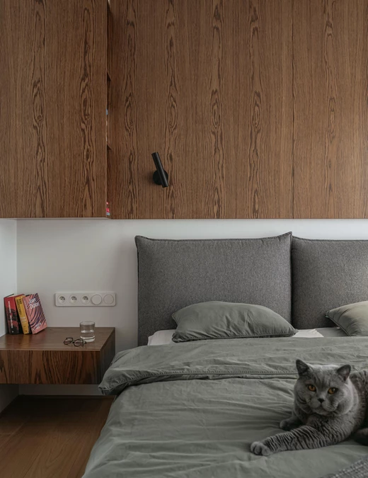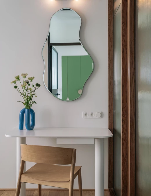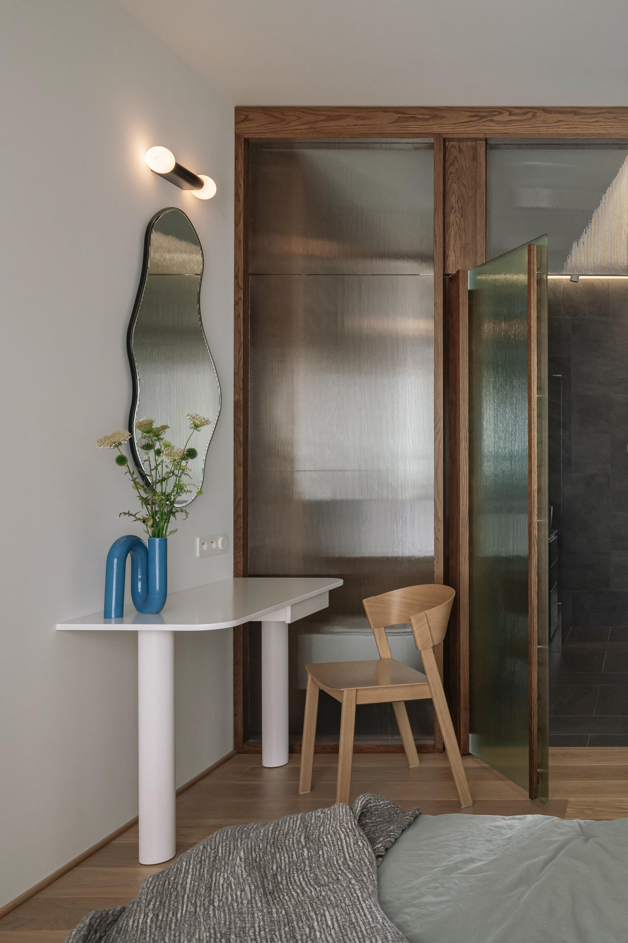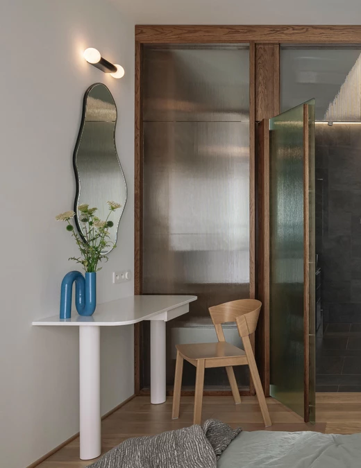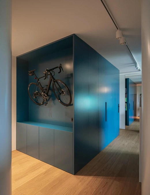 W apartamencie zaplanowano trzy sypialnie oraz garderobę usytuowaną w pobliżu jednej z nich. Prowadzą do niej dwa wejścia, co sprawia, że jest łatwo dostępna i intuicyjna w użytkowaniu. Na jednej ze ścian przewidziano tu także miejsce na rower, a w przedpokoju pojawiło się duże lustro, które porządkuje przestrzeń i dodaje wizualnej lekkości.