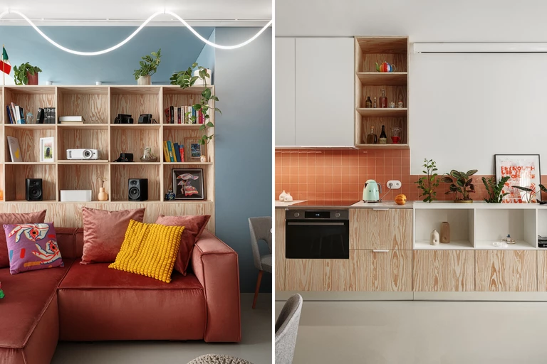 Ponadto istotną rolę w aranżacji pełni róż, który można dostrzec na komfortowej, szerokie sofie, oraz ceglasty kolor płytek kuchennych. Co ciekawe, w projekcie architektów z pracowni EMTE telewizor nie stanowi centralnego punktu pokoju dziennego (w przeciwieństwie do wielu polskich domów). Zamiast niego mieszkanie zaopatrzono w wysuwany z sufitu ekran i projektor.