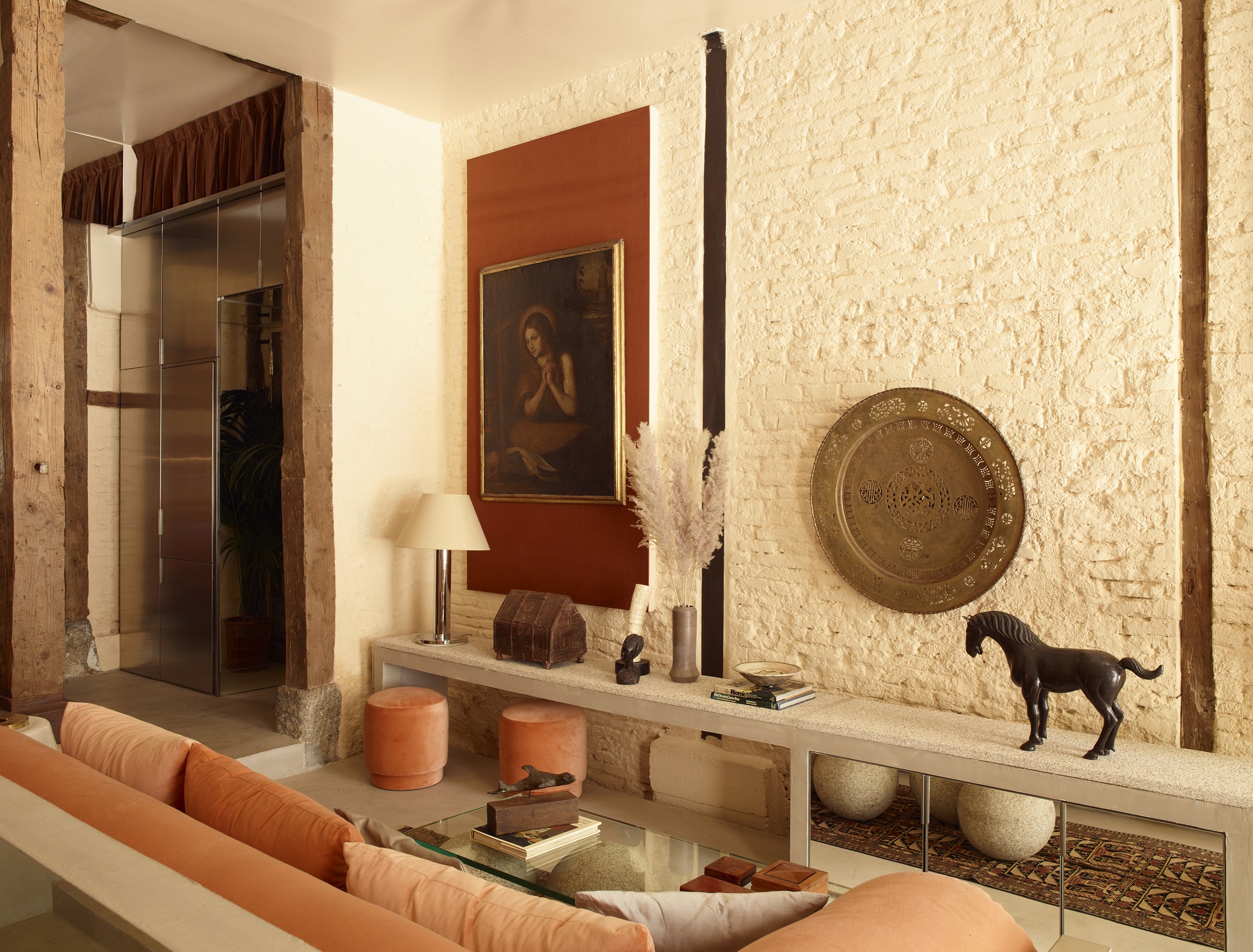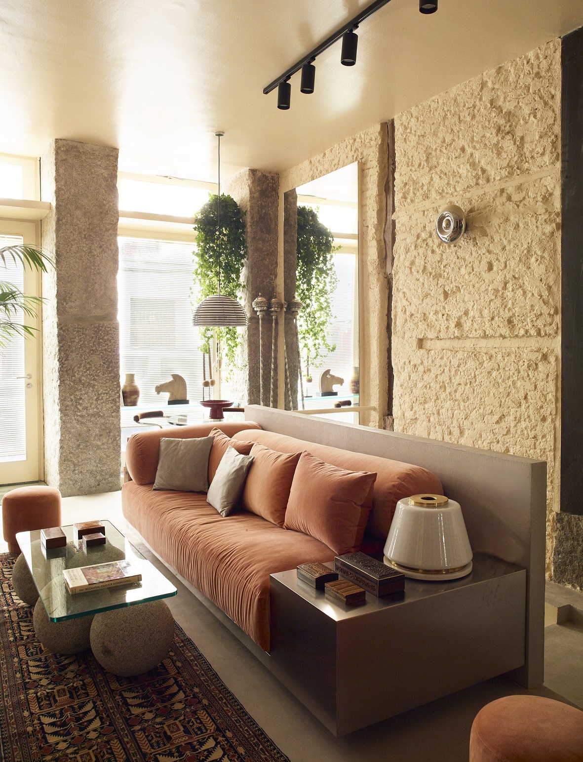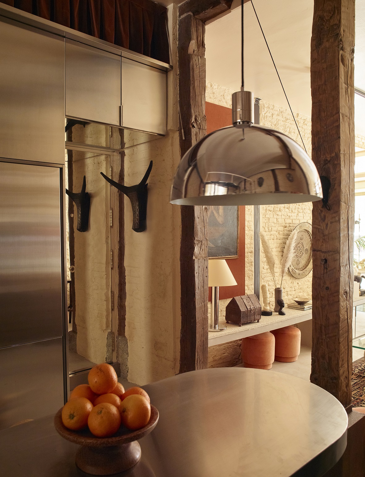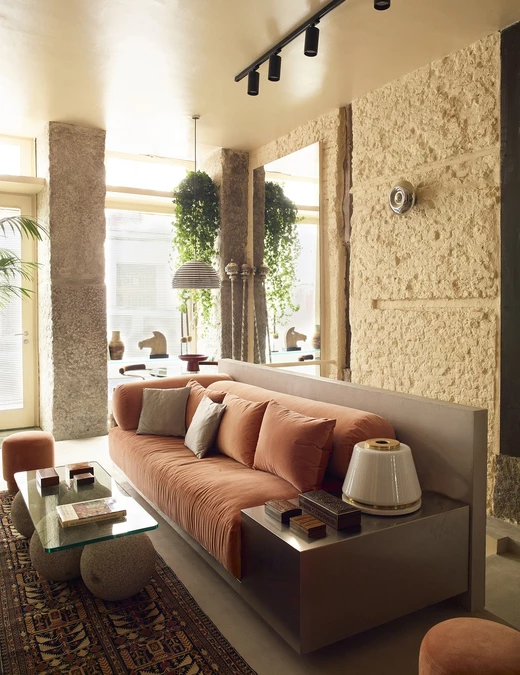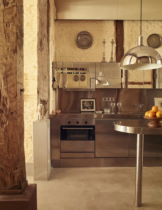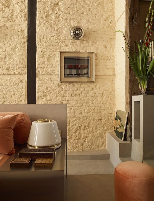 Architekci ze studia Casa Josephine oparli projekt na stonowanej palecie kolorystycznej. Dominują w niej odcienie brzoskwini i jasnego pomarańczu, zestawione z niewielką liczbą materiałów wykończeniowych. Pojawiają się beżowe cegły, odsłonięte drewniane słupy oraz beton. Wśród akcentów materiałowych ważną rolę odgrywa metal stosowany w kilku wariantach – stal, chrom i srebro, które nadają wnętrzu wyrazistości bez wrażenia ciężkości.