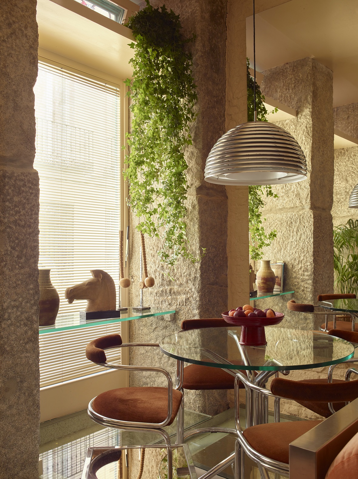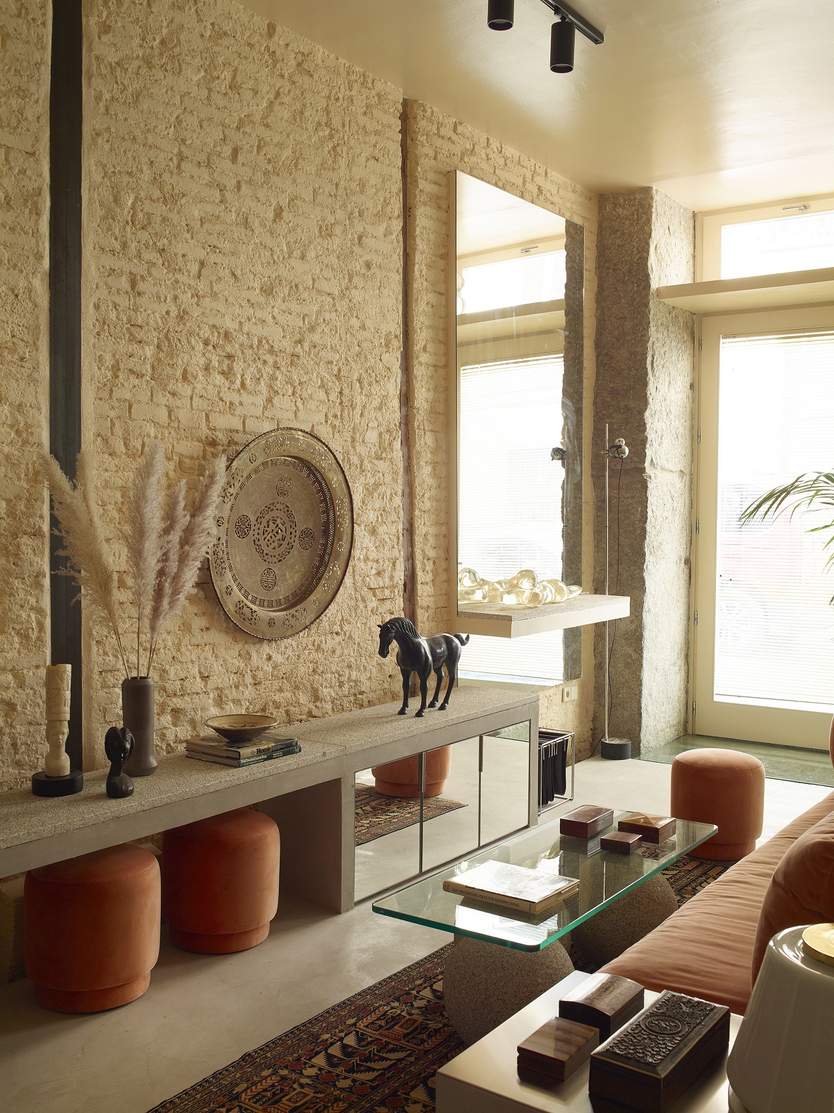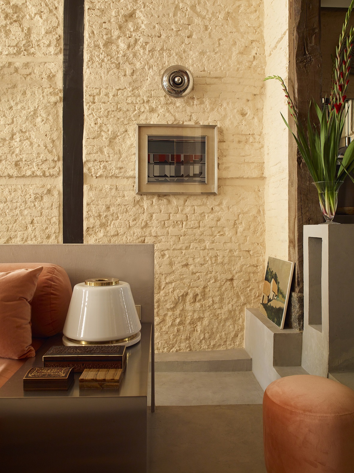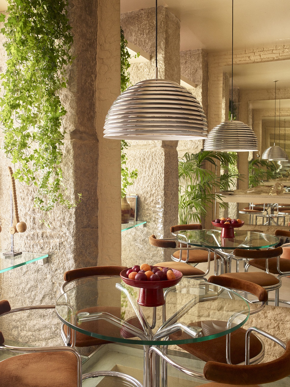 Architekci ze studia Casa Josephine oparli projekt na stonowanej palecie kolorystycznej. Dominują w niej odcienie brzoskwini i jasnego pomarańczu, zestawione z niewielką liczbą materiałów wykończeniowych. Pojawiają się beżowe cegły, odsłonięte drewniane słupy oraz beton. Wśród akcentów materiałowych ważną rolę odgrywa metal stosowany w kilku wariantach – stal, chrom i srebro, które nadają wnętrzu wyrazistości bez wrażenia ciężkości.