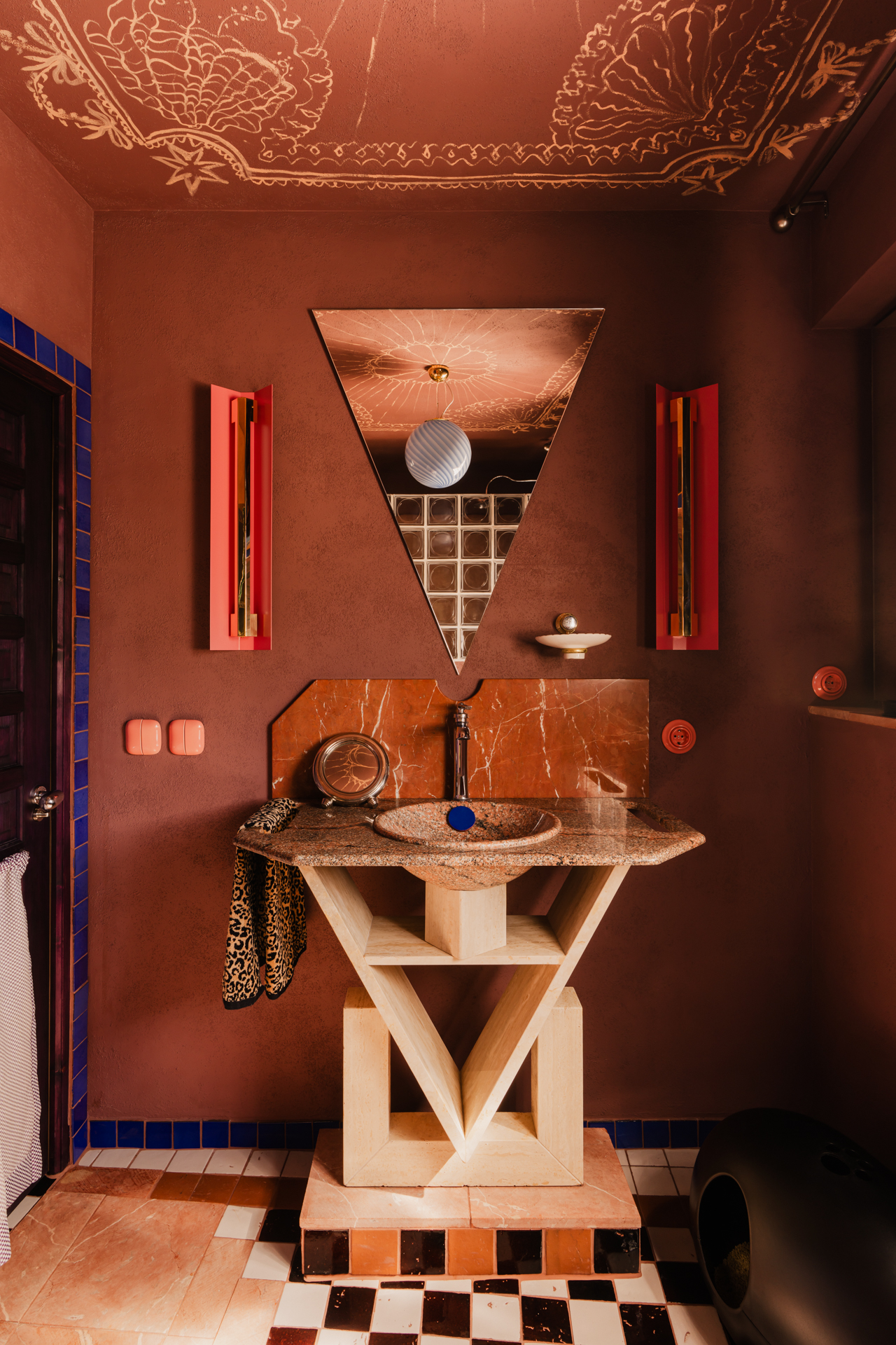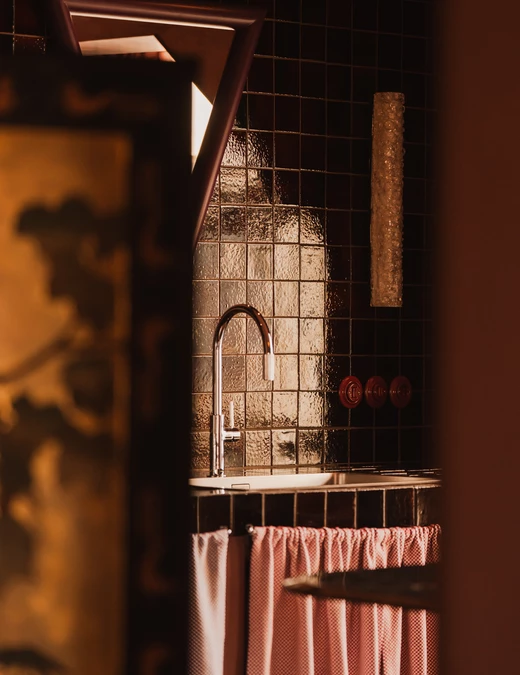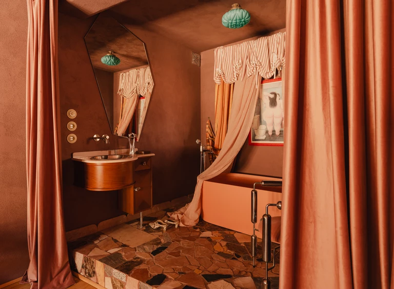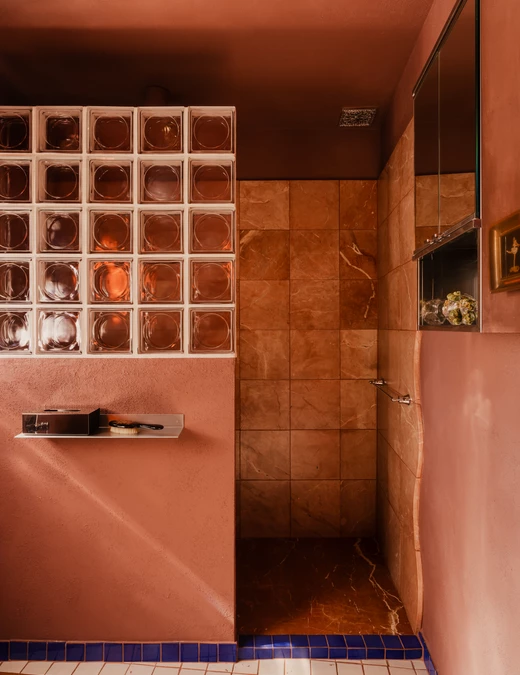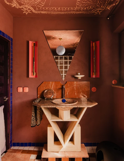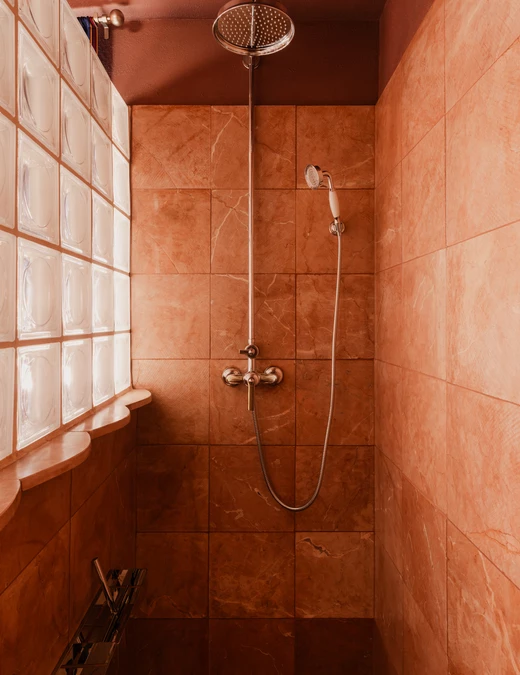 W niej pojawiają się luksfery oraz kamień Rojo Alicante, tym razem wycięty w faliste kształty. Umywalka z różowego granitu i trawertynu (zdobycz z drugiej ręki) spoczywa na podwyższeniu wykończonym szachownicą – zabieg ten, wymuszony wzrostem domowników, stał się atutem aranżacyjnym. Całość dopełnia armatura Omnires z kolekcji retro Armance oraz trójkątne lustro z kryształowym szlifem od Giera Design.