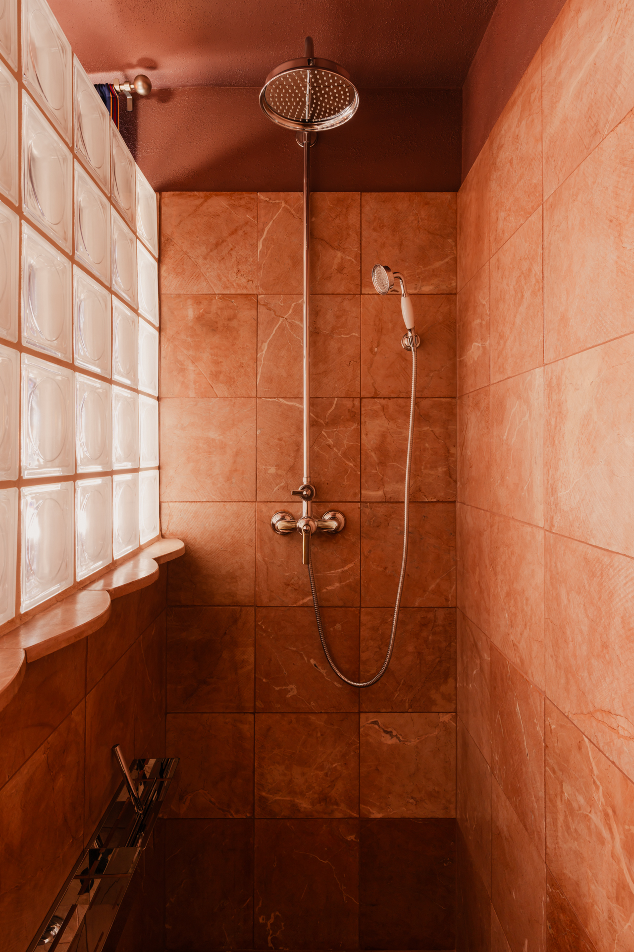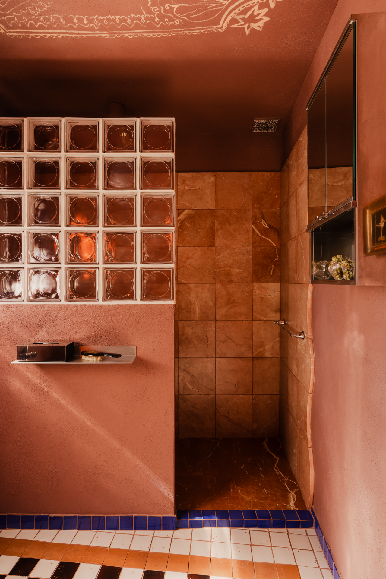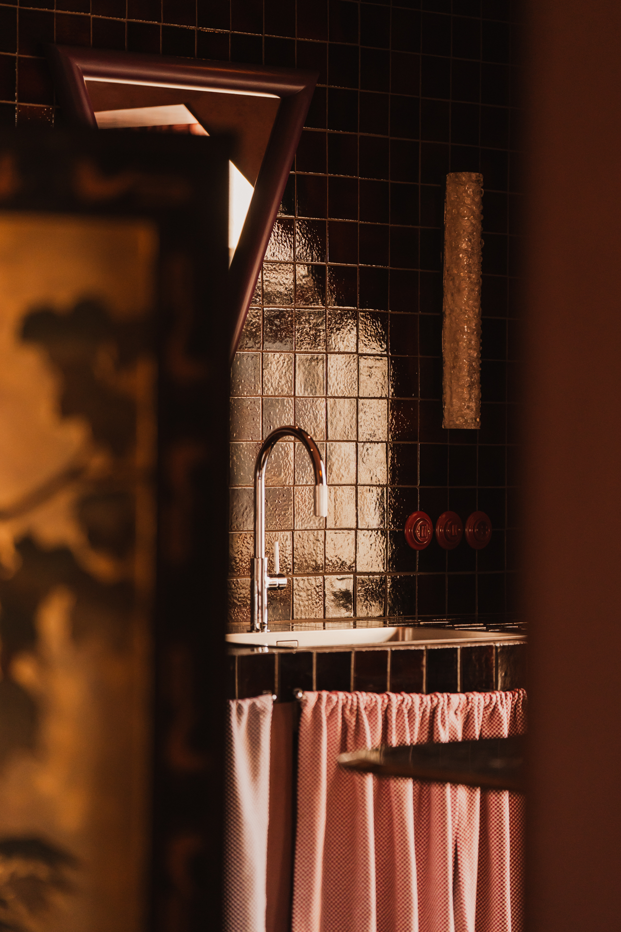 W niej pojawiają się luksfery oraz kamień Rojo Alicante, tym razem wycięty w faliste kształty. Umywalka z różowego granitu i trawertynu (zdobycz z drugiej ręki) spoczywa na podwyższeniu wykończonym szachownicą – zabieg ten, wymuszony wzrostem domowników, stał się atutem aranżacyjnym. Całość dopełnia armatura Omnires z kolekcji retro Armance oraz trójkątne lustro z kryształowym szlifem od Giera Design.
