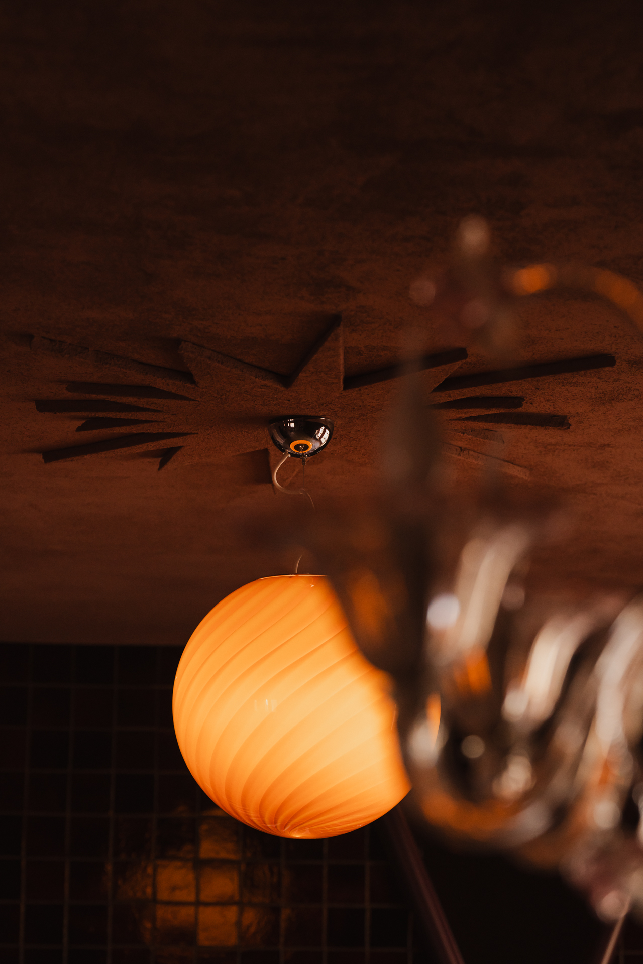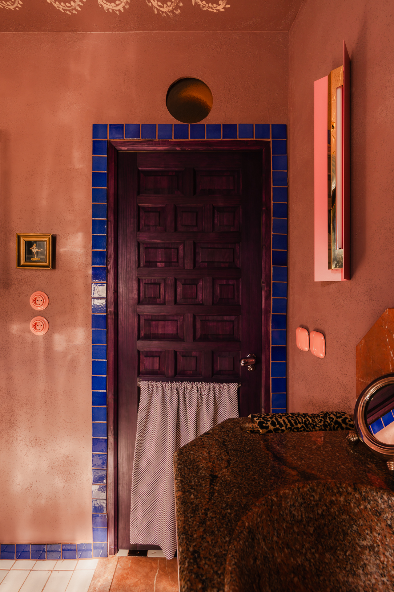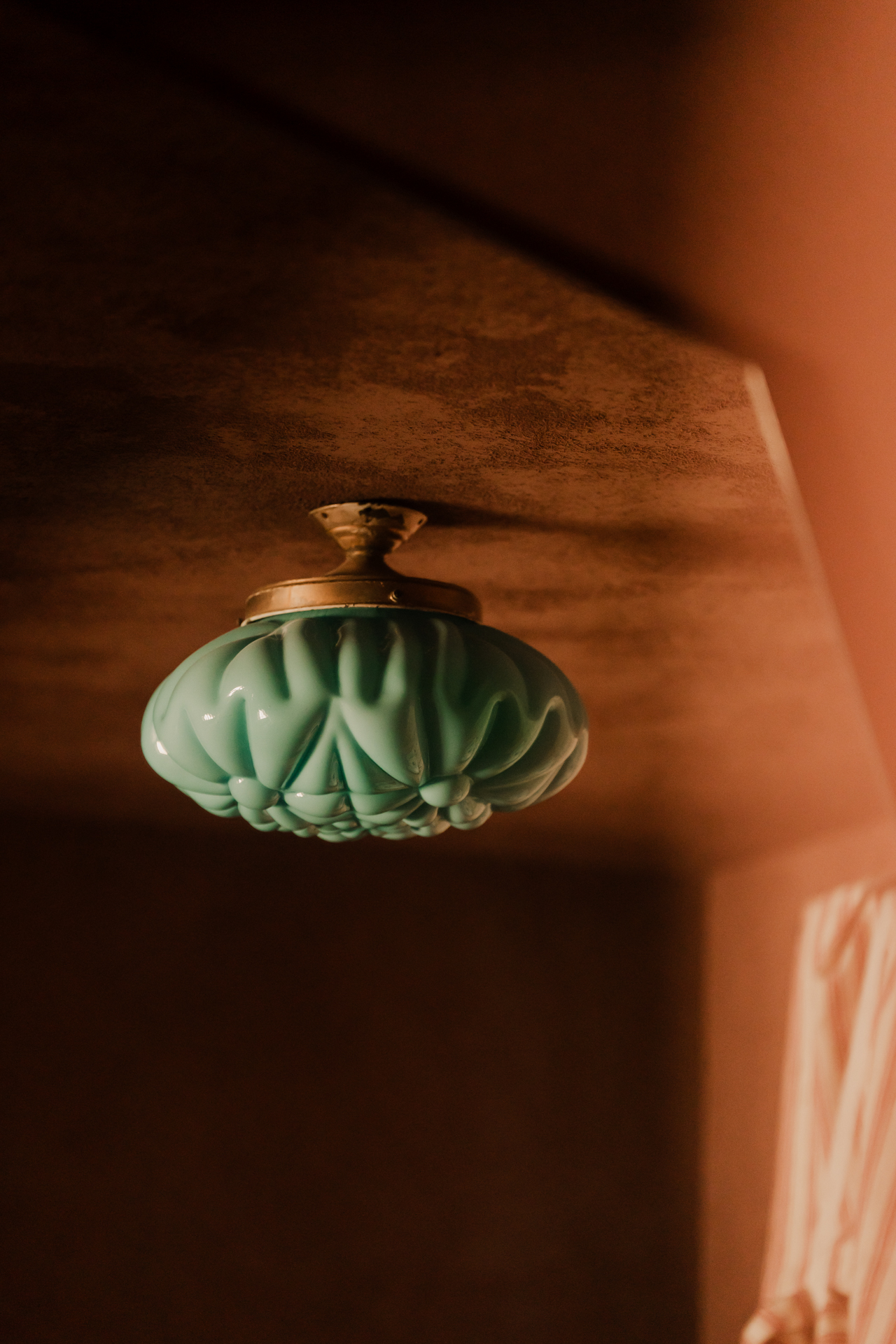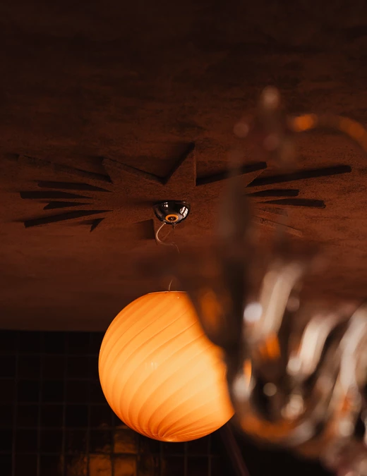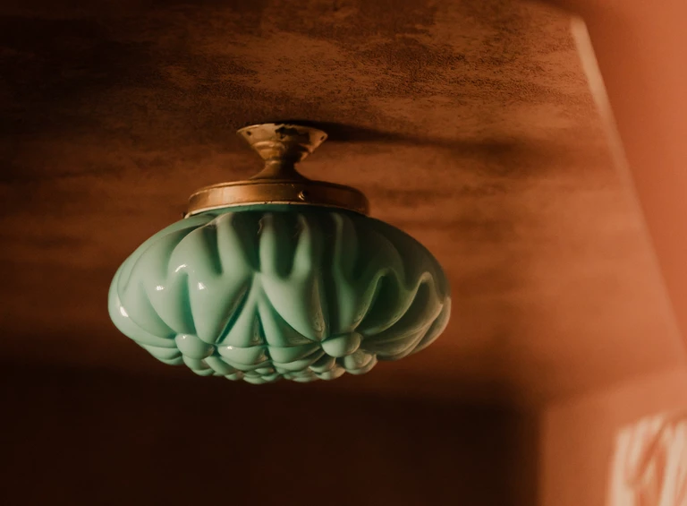 W tym domu nie ma przypadków. Na suficie architektka własnoręcznie wykonała freski inspirowane folklorem Europy Wschodniej, które stanowią jej swoisty podpis na dziele. Oświetlenie to gra kontrastów – głównym punktem jest 60-letnia lampa vintage, która mogłaby uchodzić za dzieło z Murano, a towarzyszy jej współczesna lampa z pracowni Vetro Cph. Kropką nad „i” jest osprzęt elektryczny – ceramiczne łączniki i gniazda czeskiej manufaktury Katy Paty w różnych kolorach, idealnie korespondujące z nieidealną strukturą ścian.