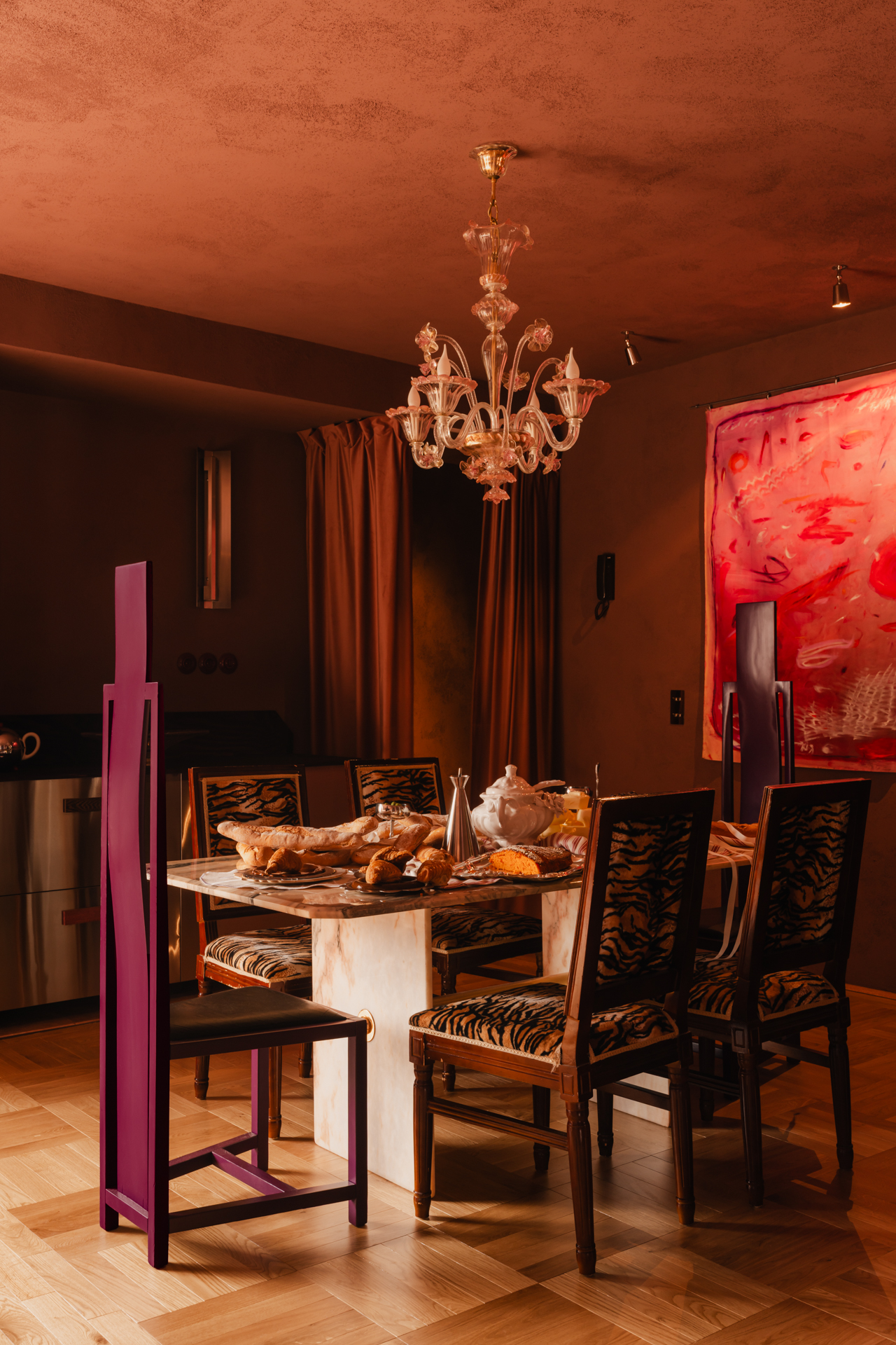 Serce domu bije przy stole. To unikatowy mebel z drugiej ręki, wykonany z portugalskiego różowego marmuru, któremu towarzyszą krzesła z wysokim oparciem, pomalowane na odważny fiolet przez profesora Marka Owsiana z Poznania.