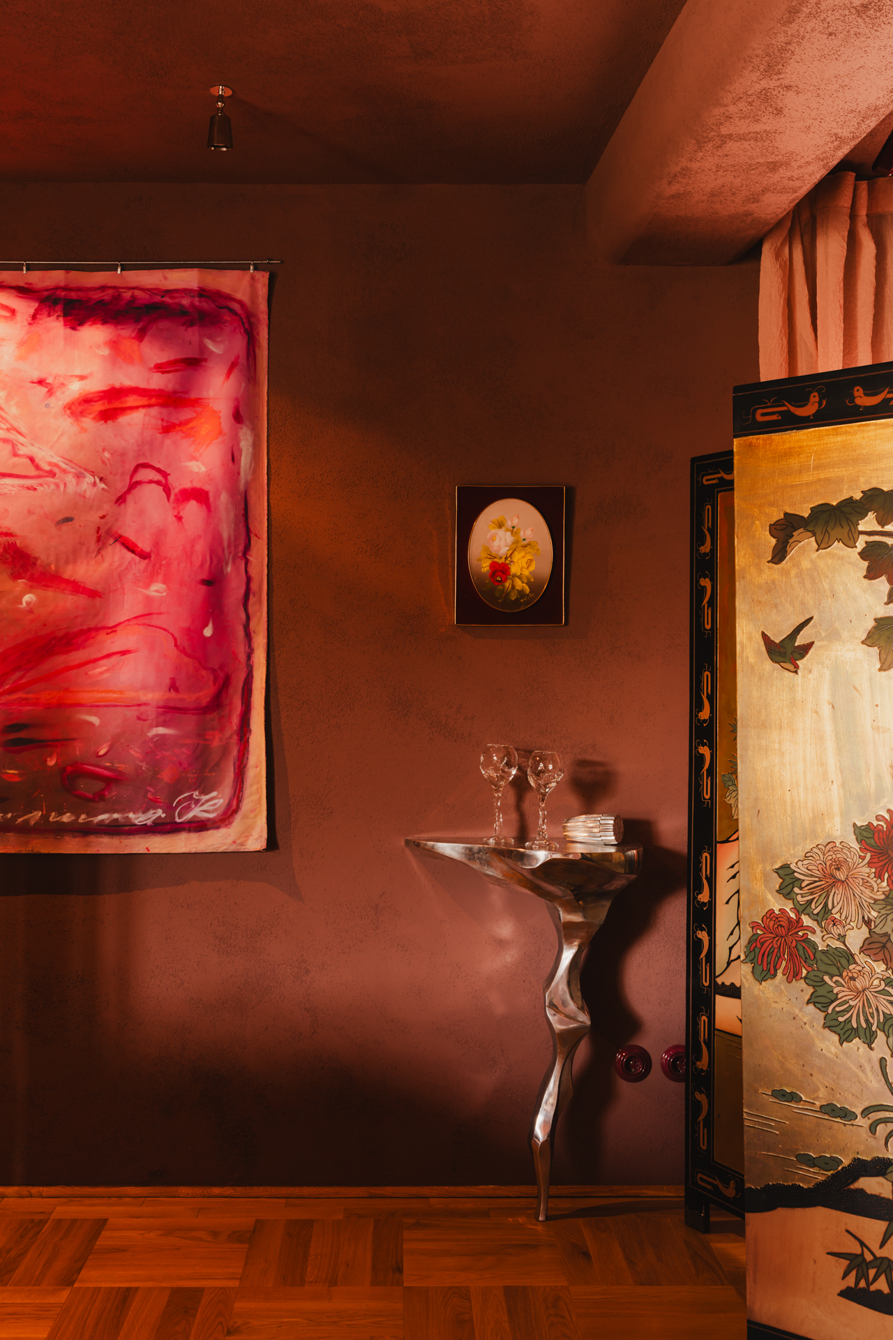Tuż obok, w niszy, zawisły minimalistyczne kinkiety Lexavala, oświetlając autorski barek wykończony srebrną tkaniną. Ścianę naprzeciwko zdobi płótno krakowskiej malarki Kasi Kotnowskiej, zawieszone na relingu niczym gobelin, bez ramy – co podkreśla swobodny, artystyczny charakter wnętrza.