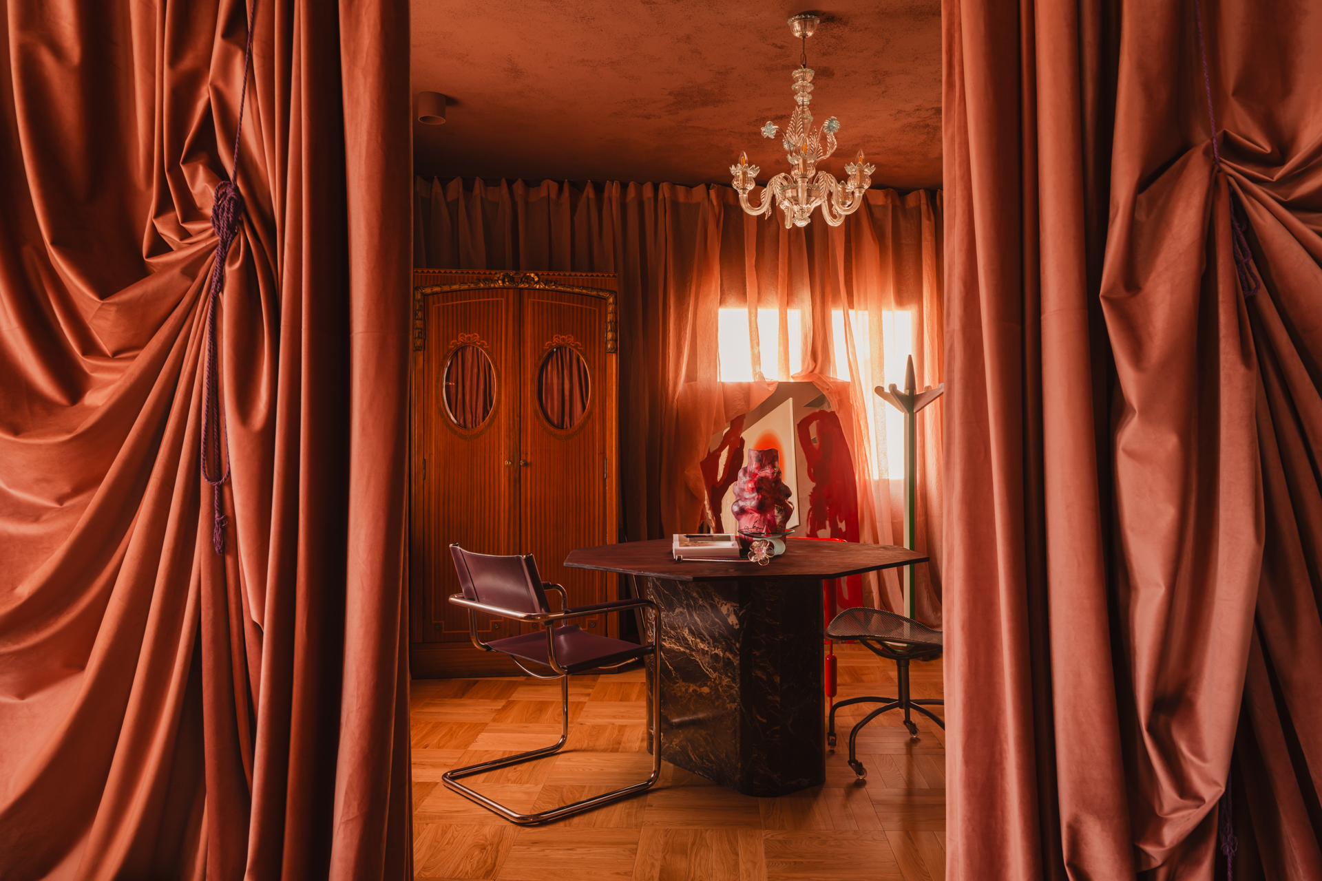 Wchodząc do tego mieszkania, od razu czuć oddech historii. Znajduje się ono przy głównym placu niewielkiego miasteczka, gdzie ulice wybrukowano regionalnym kamieniem, a fasady budynków mienią się pastelowymi odcieniami brzoskwini, bordo i mięty. To właśnie ten zewnętrzny pejzaż – krzywizny starych murów i „nieidealny szept” ubiegłych wieków – stał się główną inspiracją dla projektu.