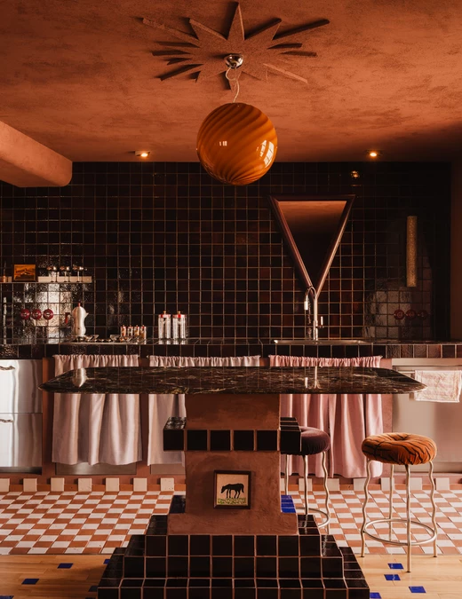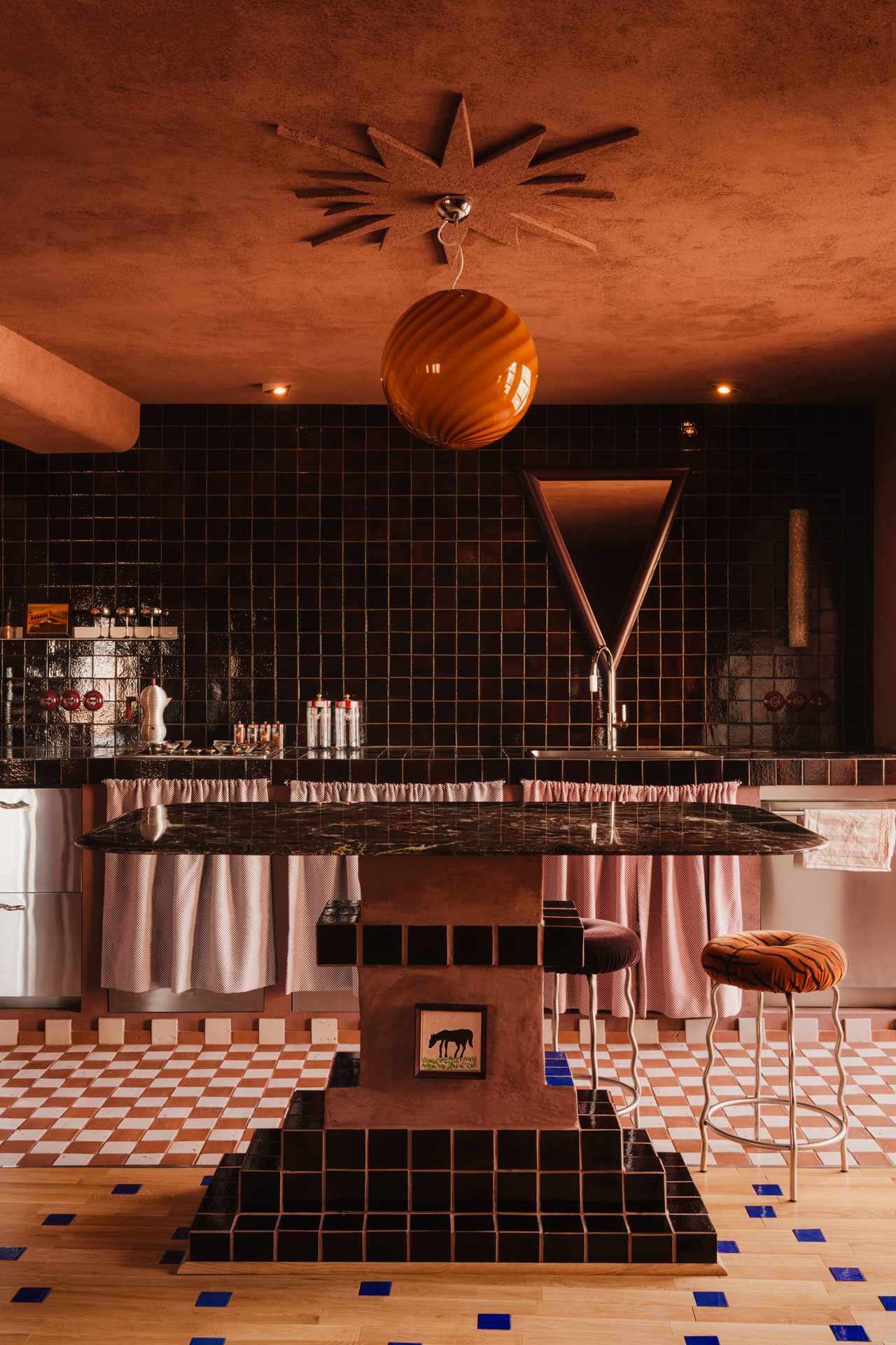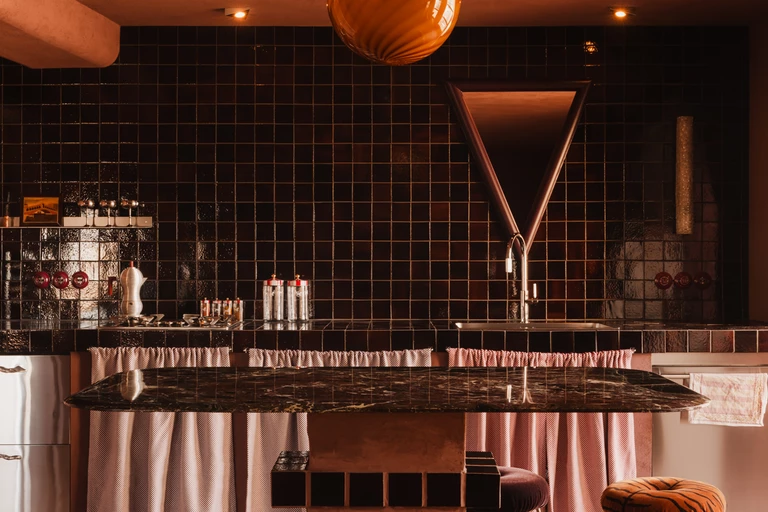 Wnętrze zaskakuje miękkością. Ściany pokryto farbą strukturalną, która w dotyku i odbiorze wizualnym przypomina welur, a kanciaste narożniki filarów konstrukcyjnych zostały zaoblone, co dodatkowo „otula” przestrzeń. W tej scenerii kuchnia w stylu hiszpańskim, z zasłonkami zamiast tradycyjnych frontów, wydaje się naturalnym wyborem – to od niej zaczął się cały proces projektowy.