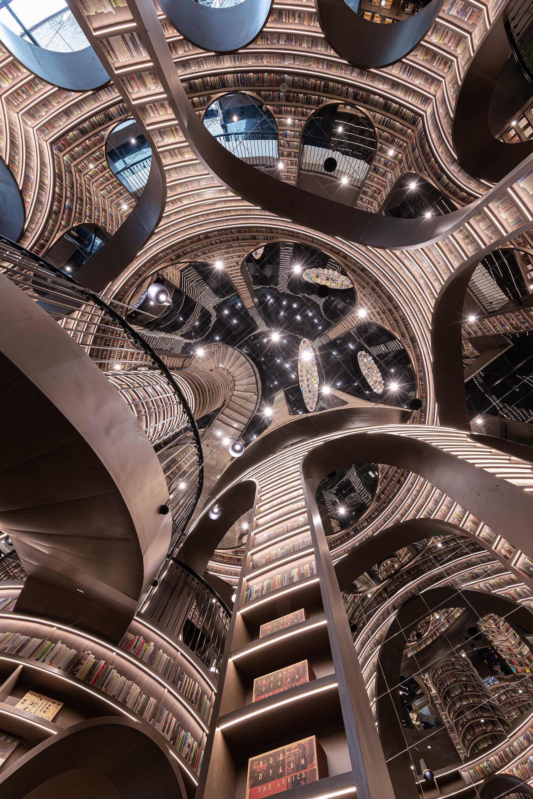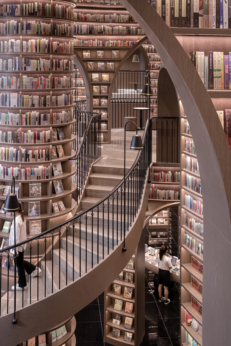 Główna przestrzeń czytelnicza została zaprojektowana tak, by budować poczucie intymności w skali makro. Wędrując pod łukowatymi regałami, czytelnik czuje się, jakby spacerował wzdłuż okapów tradycyjnych domów lub zagłębiał się w leśne gęstwiny. Każdy element, od regałów wplecionych w kolumny po ukryte za drzwiami w ścianach książek funkcjonalne zakątki, ma pobudzać ciekawość i prowadzić głębiej w świat opowieści. Nawet klatki schodowe zostały wykorzystane jako aktywne biblioteki, gdzie każda książka jest na wyciągnięcie ręki, a te znajdujące się wyżej tworzą majestatyczne tło dzięki specjalnym grafikom.