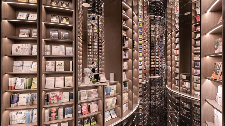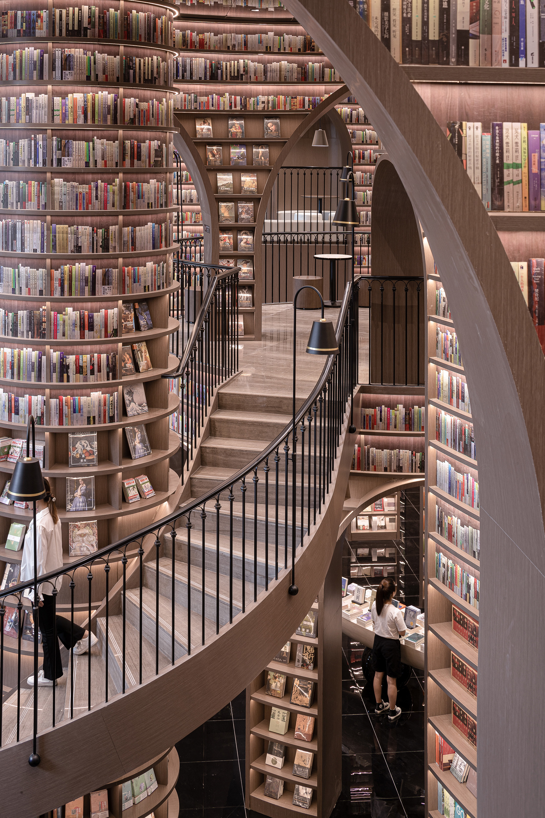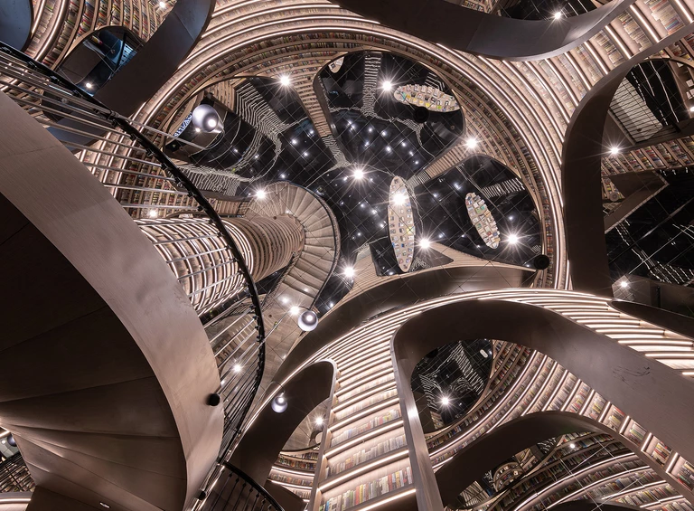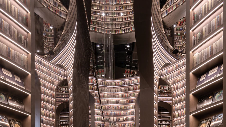 Wysokie ściany z książkami, zainspirowane konstrukcją wielkiej tamy Dujiangyan, pną się ku górze niczym monumentalny mur obronny zbudowany z kultury i historii. Na tle czarnej, lśniącej podłogi ustawiono stoły ekspozycyjne, które przypominają łodzie zacumowane na spokojnym jeziorze, dryfujące między rzędami lektur. To tutaj architektura spotyka się z dynamiką natury – układ przejść i struktur ma odzwierciedlać zmienność klimatu, od wiatru po mgłę, tworząc scenerię, która zachwyca przy każdym kroku.