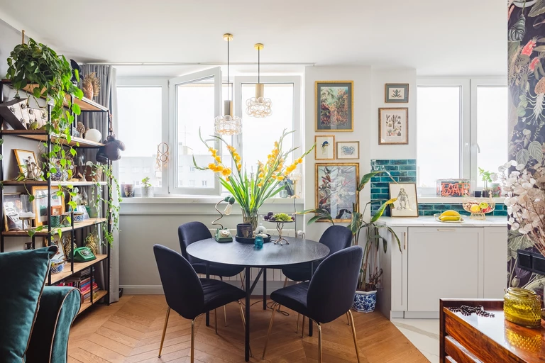Nie sposób nie zwrócić też uwagi na szklany stolik kawowy na złoconej nodze o niesamowitym floralnym kształcie. Pod oknem znajduje się prosty regał, ozdobiony przez żywe rośliny oraz różnego typu grafiki, obrazy i inne ozdoby. Poza powracającymi zestawieniami kolorystycznymi, przez całe mieszkanie przewijają się też motywy zwierzęce – w szczególności przedstawiające motyle i ptaki. Aby nie pozwolić na efekt przeładowania, Barbara Godawska zdecydowała się na minimalistyczne krzesła i okrągły stół jadalniany – wszystko w odcieniach czerni.
