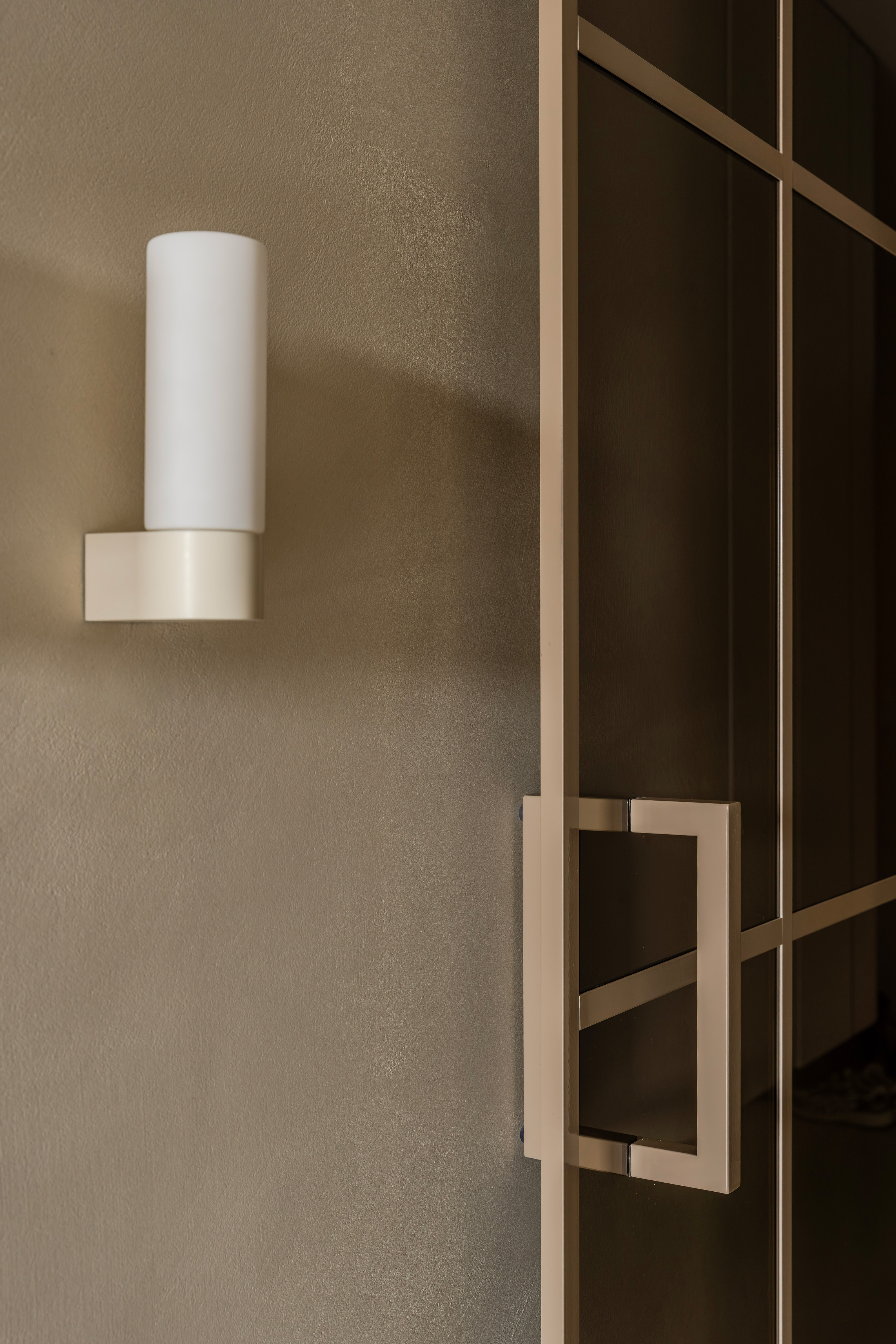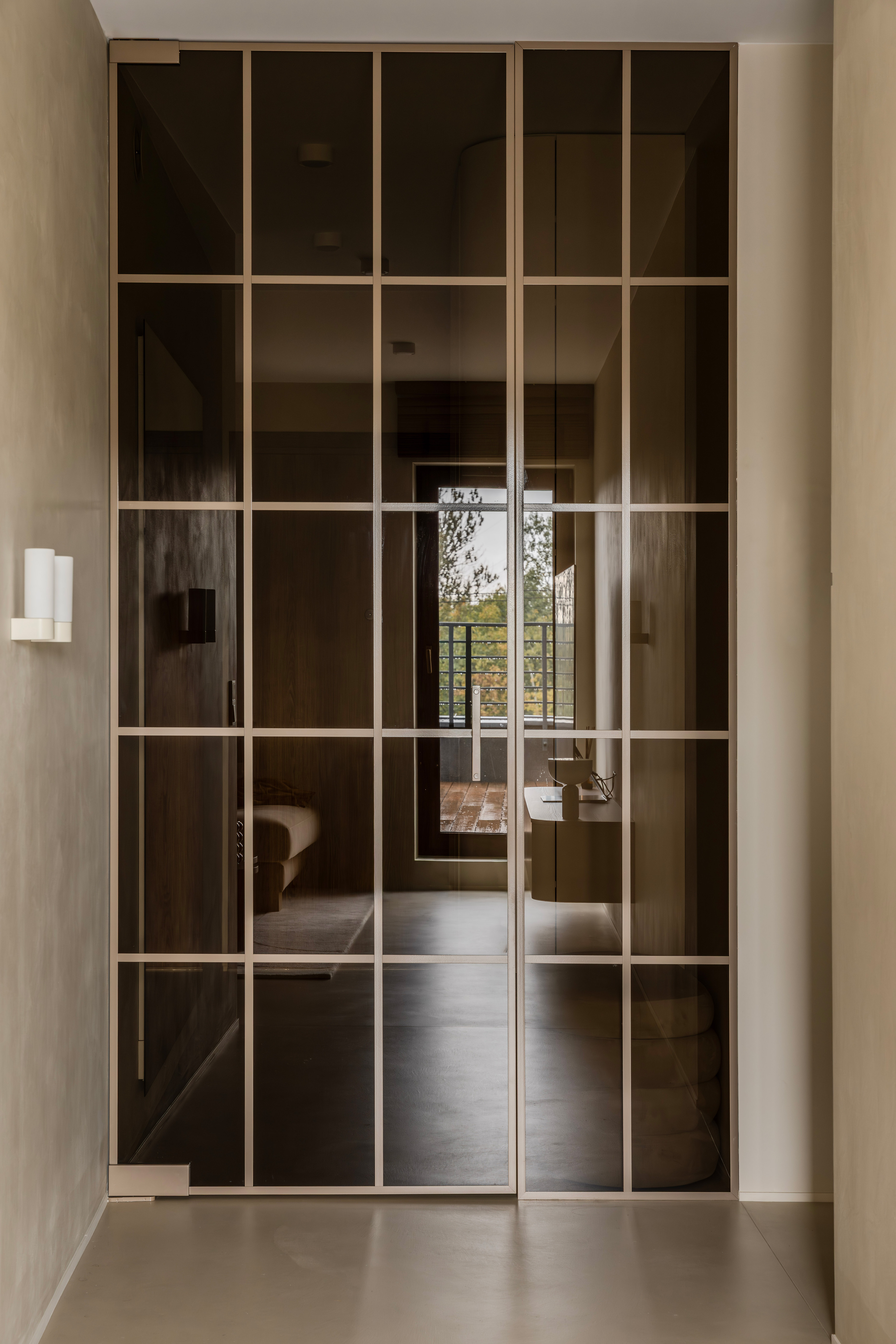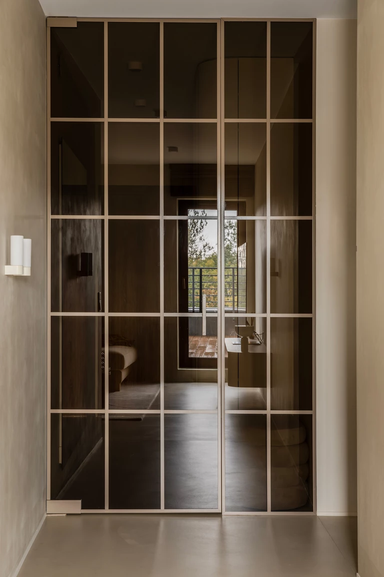 Architekci, aby scalić obie przestrzenie, sięgnęli po nietypowe rozwiązanie – do mieszkania „wciągnięty” został fragment korytarza z klatki schodowej. W nowym układzie stał się on funkcjonalnym wiatrołapem, który wieńczą imponujące, szklane drzwi sięgające samego sufitu.