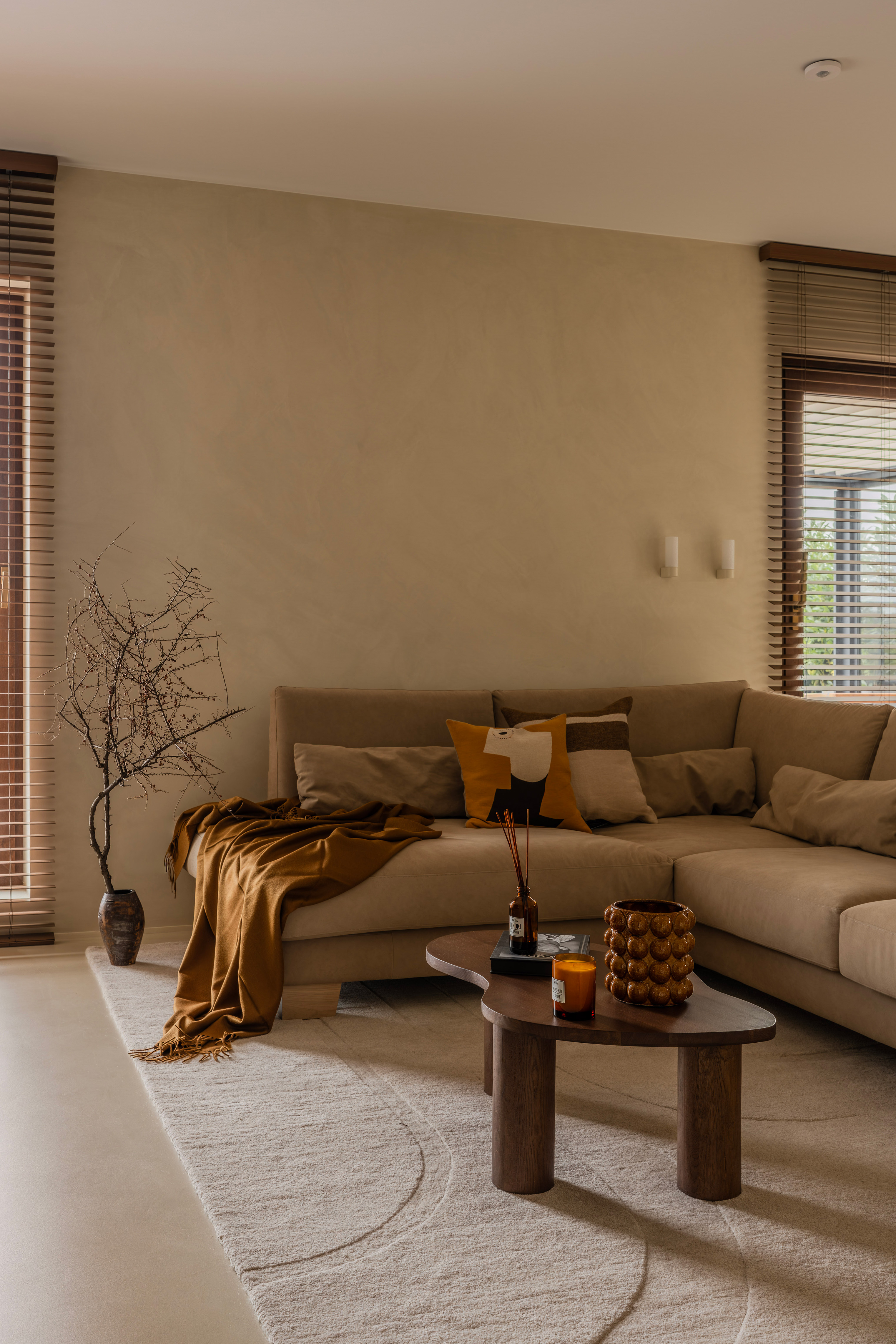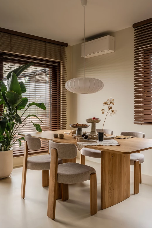 Zgodnie z założeniem, wnętrze ma w sobie nutkę egzotyki. Całość skąpana jest w słonecznych, ciepłych odcieniach i miękkich fakturach. Dominują tu kolory ziemi – biele, beże i brązy, budujące atmosferę spokoju.