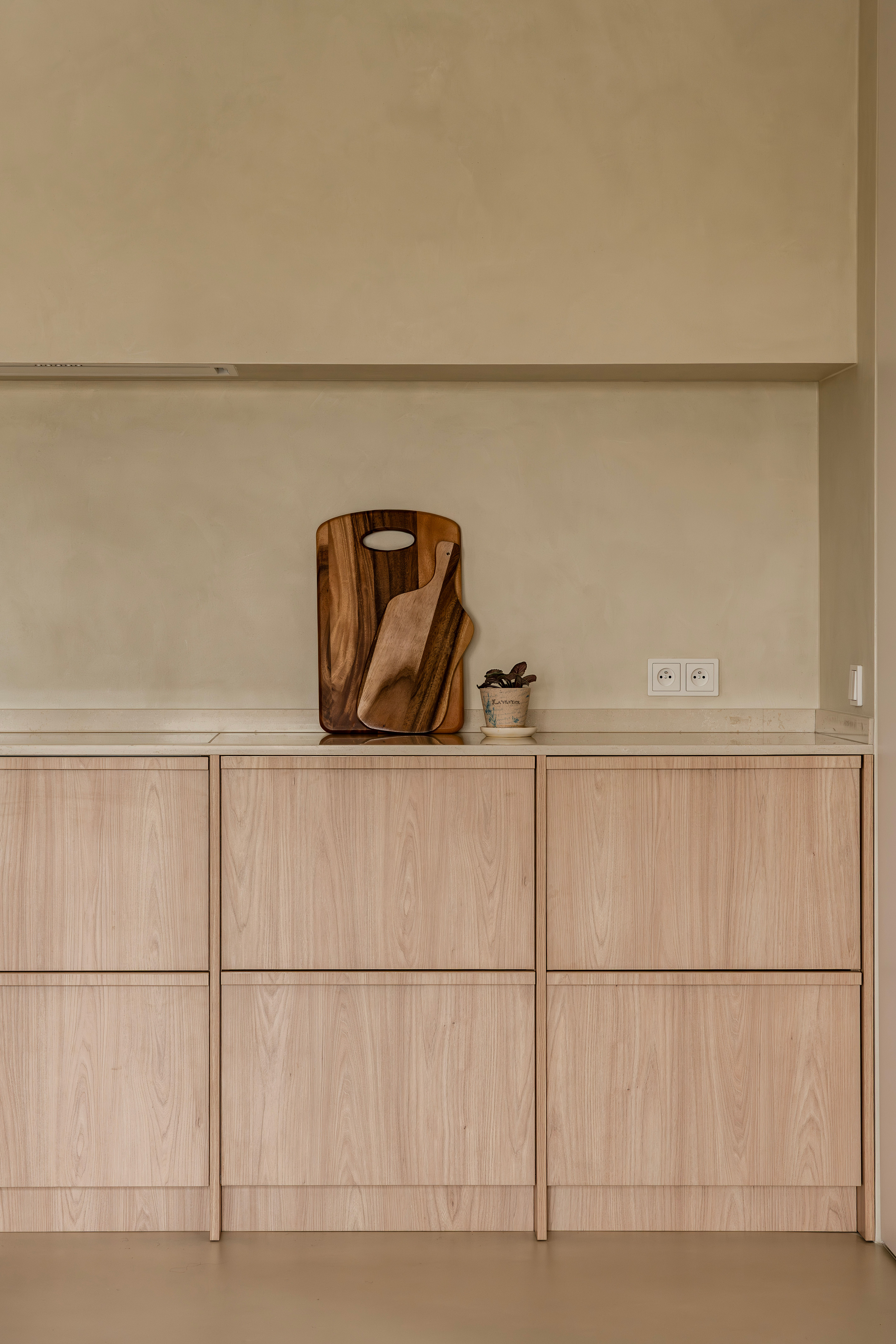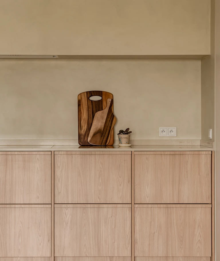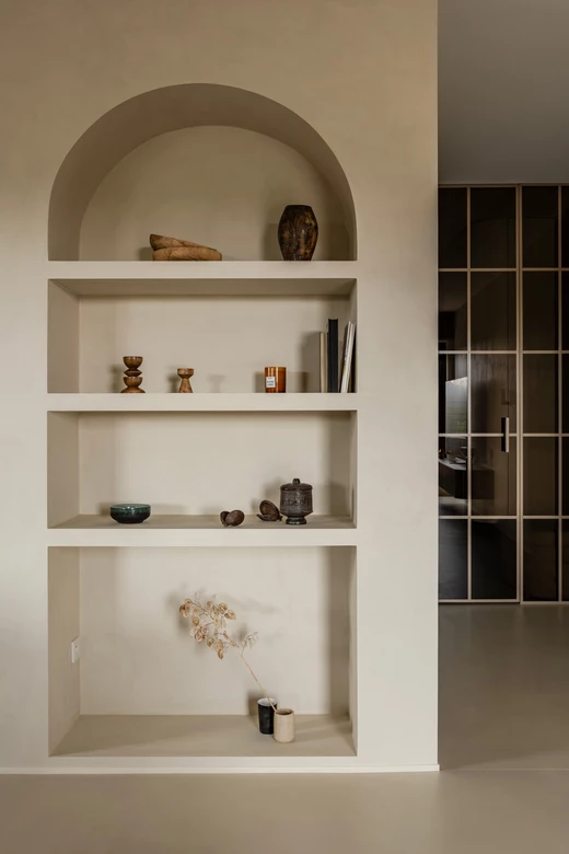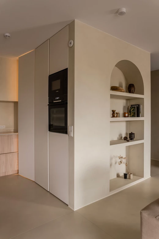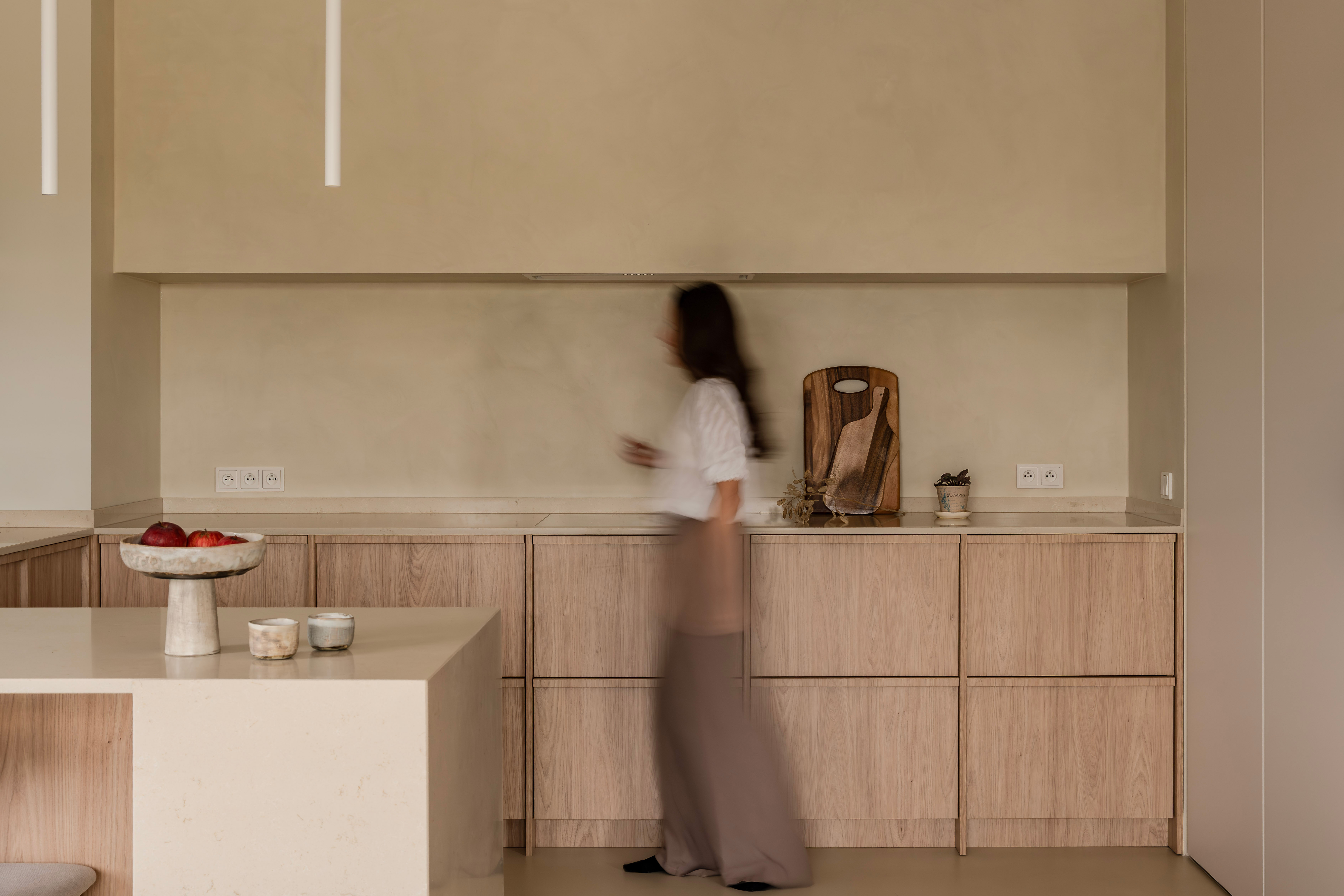 Mimo wyraźnego podziału na strefy, wnętrze odczytuje się jako spójną całość. Przestrzenie łagodnie się przenikają, głównie za sprawą konsekwentnie użytych materiałów wykończeniowych. Kluczową rolę odgrywa tu mikrocement - jego jasne i ciemniejsze odcienie scalają podzielone wnętrze, zacierając granice między dawnymi lokalami.