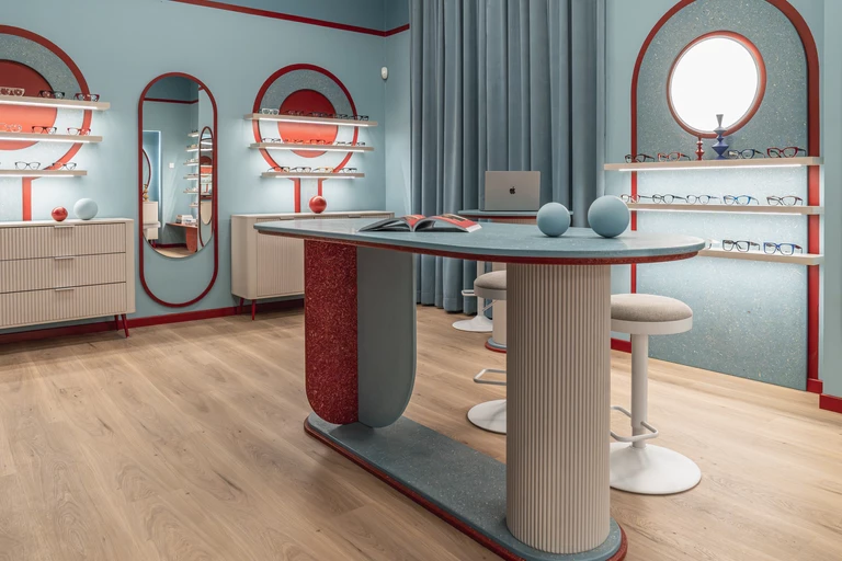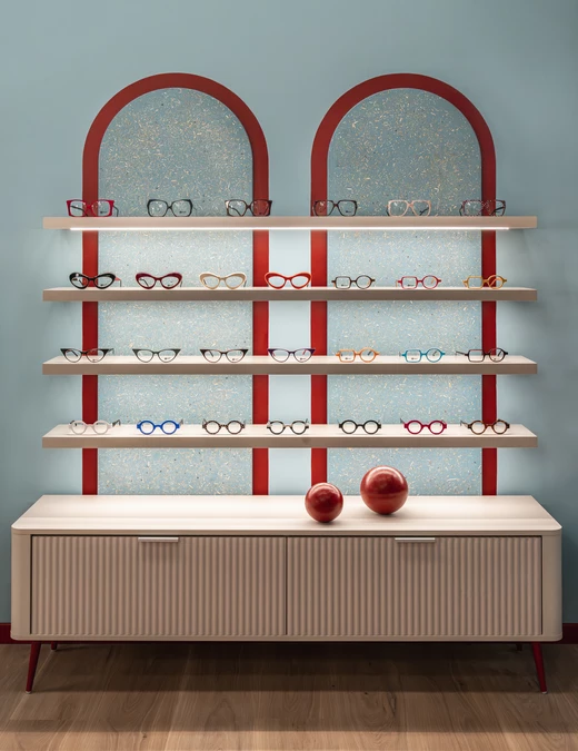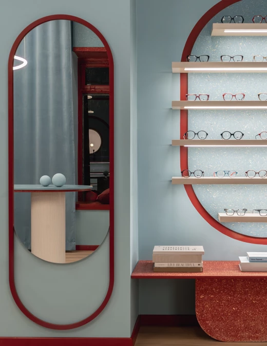 „Pomieszczenie o powierzchni 25 m² ekspozycji i 4 m² zaplecza to niewiele, by poczuć głębię przestrzeni w nowych okularach” – zauważa Tomasz Pągowski. Atutem projektu okazały się jednak dwie duże witryny z głębokimi parapetami, zamknięte w metalowej ramie, dające sporo dziennego światła i widok na zieleń przeciwległego Parku Morskie Oko. Głębię perspektywy projektanci zmultiplikowali przemyślanym rozmieszczeniem luster.