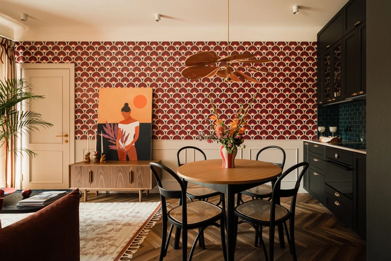To właśnie Dalia dała tytuł krakowskiemu projektowi Yany Molodykh. Botaniczne nawiązania odnajdziemy m.in. we wzorze tapety w salonie (prod. PaperMint Paris) czy rozłożystej niczym kwiat lampie „Pale” francuskiej marki Georges. Uroku retro części dziennej dodają zaś stare lustro w pozłacanej ramie czy tradycyjne thonetowskie krzesła z giętej sklejki. Z czerwienią tapety zgrano sofę polskiej marki Moma Studio i wzór na zasłonach od Guell Lamadrid.