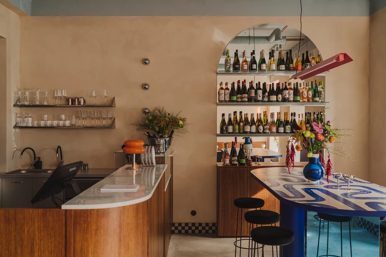 Bohaterem pierwszego planu jest główny stół, który stał się już znakiem rozpoznawczym lokalu. Ten owalny mebel, którego blat pokrył wyrazisty, kobaltowy wzór, wsparty jest na na dwóch nogach – walcowatej i lustrzanej, która dodatkowo dodaje wnętrzu głębi. Ten mocny akcent kontrastuje z dość powściągliwą przestrzenią lokalu.