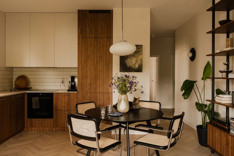 Układ mieszkania został precyzyjnie dopasowany do rytmu życia mieszkańców i ich dwóch kotów. Otwarta na salon kuchnia została subtelnie oddzielona od strefy wypoczynku okrągłym stołem w ciemnym wykończeniu. Dzięki projektowanym na wymiar zabudowom udało się ukryć wszystkie niezbędne funkcje, zachowując jednocześnie wizualną lekkość aranżacji.
