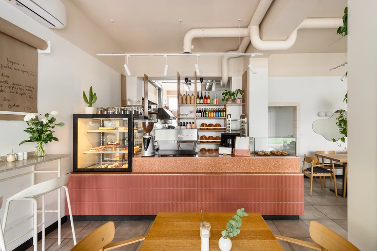 Ostatecznie na wprost wejścia znalazła się sporych rozmiarów lada, wykończona płytkami terazzo oraz mniejszymi kafelkami marki Paradyż, z kolekcji „Neve Creative” Mai Ganszyniec. Jej barwy, czyli ciepły róż i kolor ceglasty, stanowią najmocniejsze akcenty kolorystyczne w przestrzeni. Za ladą umiejscowiono ażurowy regał z drewna, który oddziela strefę kuchni od klientów, a także służy do ekspozycji produktów.