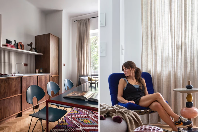 Zabudowa kuchenna urzeka orzechowymi frontami w ramce, które zestawiono z beżem trapezoidalnych płytek. Ich barwa została przeniesiona na szafkę okapową o zaoblonych bokach i półkę, na której stanęła drewniana rzeźba duńskiej marki boyhood przywodząca na myśl balonowe psy Jeffa Koonsa. Przytulności przestrzeni dodają piękny dywan przywieziony ze Stambułu oraz prosta sofa ustawiona na tle okna i zielonej roślinności. Duży stół połączono z niebieskimi, postmodernistycznymi krzesłami Mikado, zaprojektowanymi przez Waltera Leemana.