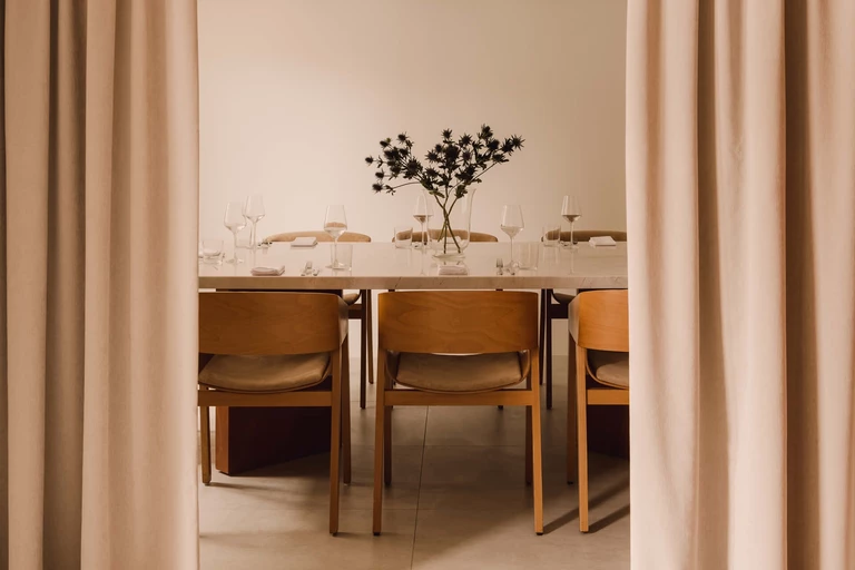 Całość dopełniono oryginalnymi detalami, takimi jak antyczne wazy, kamienna umywalka przy wejściu czy szklano-mosiężne lampy. Kolorowe wykończenia na barze oraz kanapach ocieplają stonowaną przestrzeń.