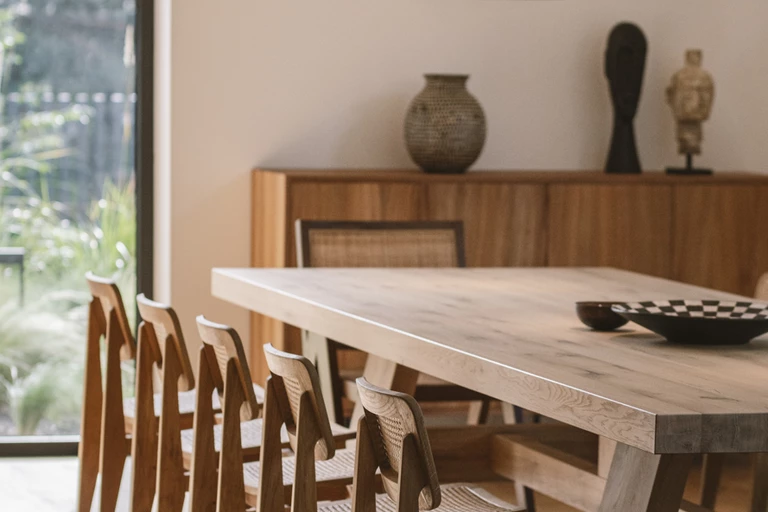 Lite drewno dębowe i prosta, solidna konstrukcja dopełnione zostały zestawem delikatnych krzeseł marki Gubi, dwoma fotelami projektu Pierre’a Jeannereta i kompozycją wiszących lamp Marset. Poza oświetleniem dekoracyjnym, cały dom wyposażony został w minimalistyczne oprawy marki Chors. Dopełnieniem głównego zestawu jadalnianego jest czarna witryna na zastawę stołową i ekspozycję win oraz komoda z drewna wiązowego.