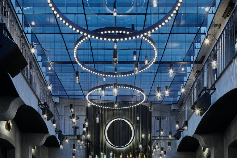 W centralnej części głównego pomieszczenia znajduje się bar, nad którym wznosi się imponujący sufit ze szkła. Dawniej wewnętrzny dziedziniec, teraz serce Moon Club — to pomieszczenie stanowiło największe wyzwanie dla architektów. Przede wszystkim ze względu na techniczne kwestie związane z akustyką — wymagały one zamontowania specjalnych ścianek akustycznych oraz tynków, które musiały zostać wkomponowane w koncepcję wnętrza.