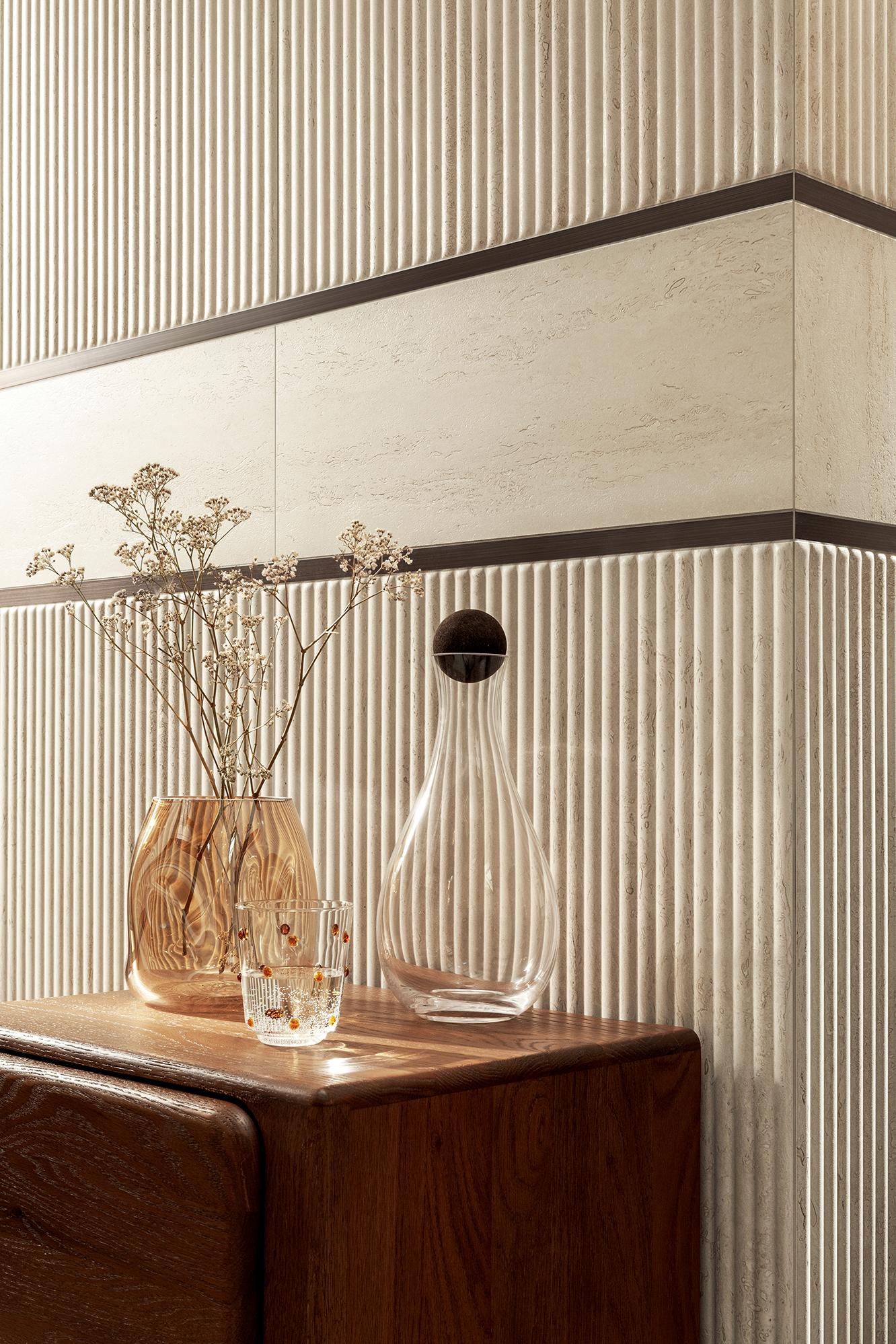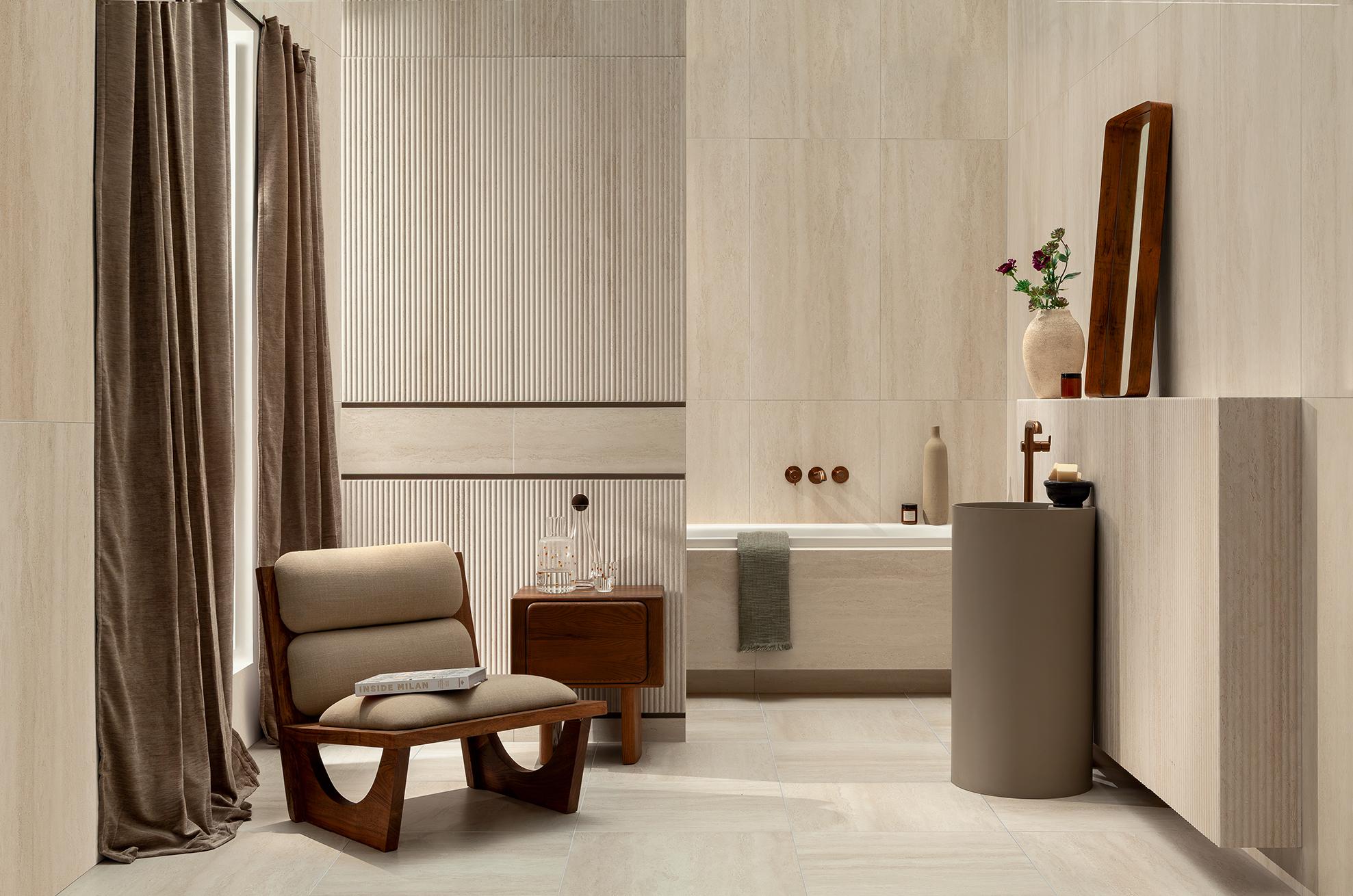 W kolekcji znalazł się także elegancki, szary wariant kamienia, inspirowany jego chłodniejszymi odmianami, który dobrze odnajduje się w bardziej nowoczesnych przestrzeniach. Całość uzupełnia Echo Antico – stonowana interpretacja trawertynu łącząca nuty szarości i beżu.