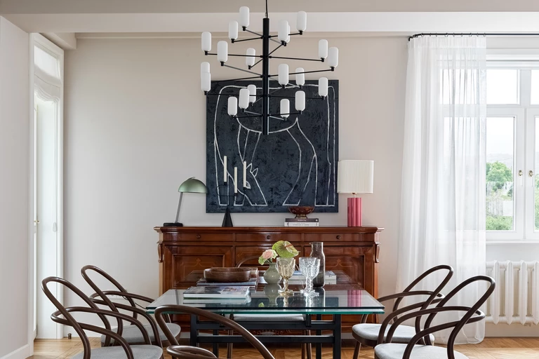 Stare elementy wyposażenia skomponowano tu z nowymi meblami, oświetleniem i dodatkami do wnętrz. Obok mebli vintage nie zabrakło tu współczesnego dizajnu: w pokoju syna świetnie prezentuje się lampa „Triangle” marki HKliving, w pokoju starszej córki góruje lampa „Dancing” od Menu, z kolei w głównej sypialni wzrok przyciąga lampa „TRIPOD HM8” marki & Tradition. Na uwagę zasługuje też stojący w salonie fotel „Augustin” holenderskiej firmy EICHHOLTZ, powszechnie uwielbiany przez miłośników wzornictwa.