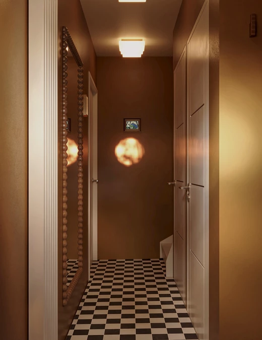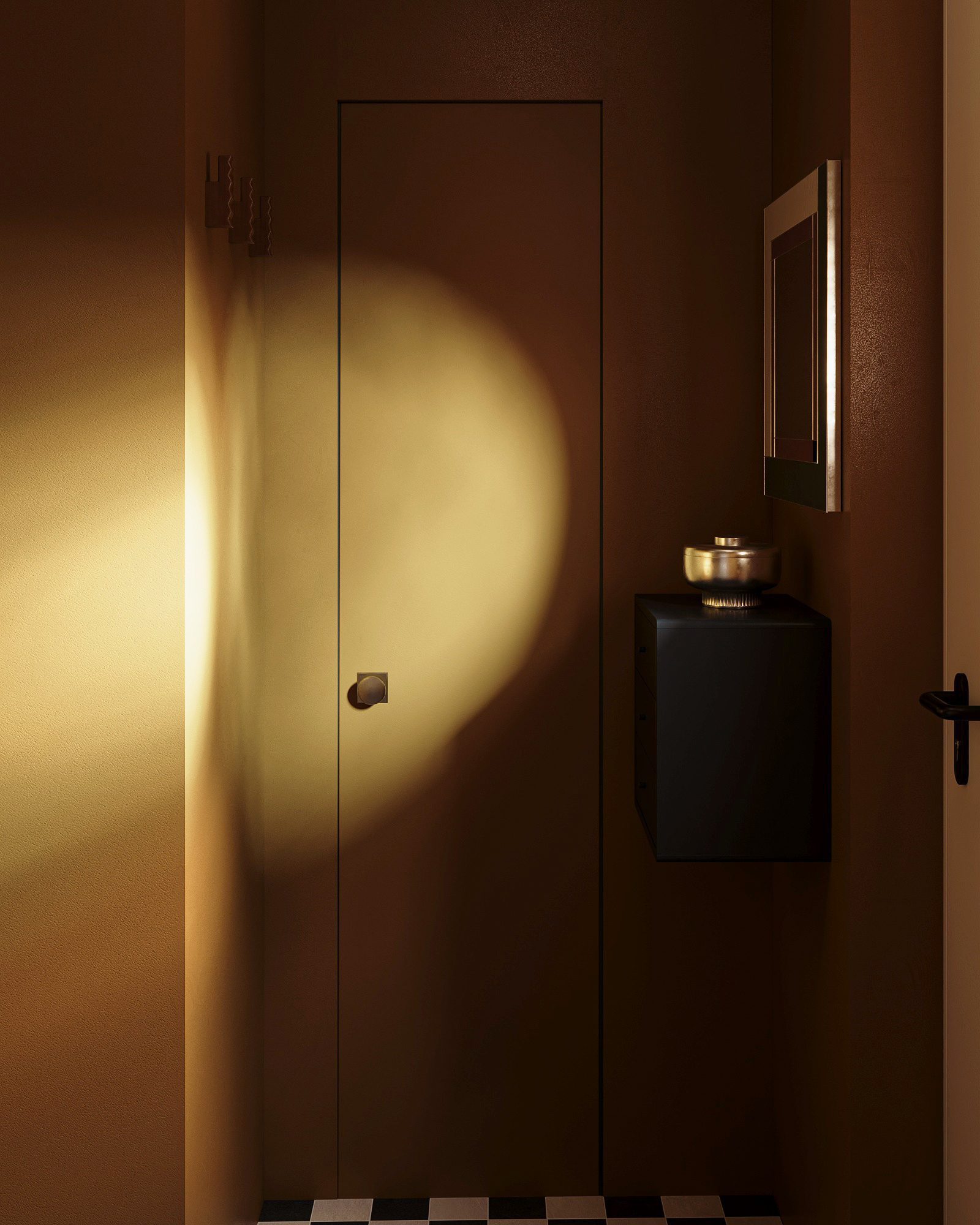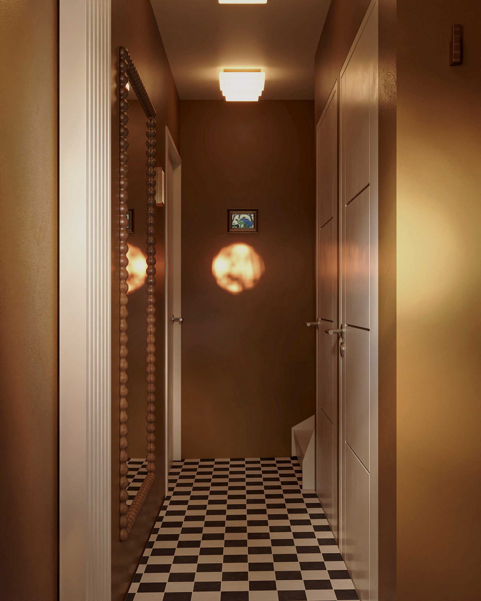 Zespół z ukraińskiej pracowni Amici Buro odrzucił bezpieczną i neutralną paletę barw na rzecz ciemnych kolorów budujących głębię – już od samego progu. Na strefę wejścia projektantki wybrały głęboki musztardowy odcień, który świetnie sprawdza się jako tło dla światła wpadającego przez drzwi.